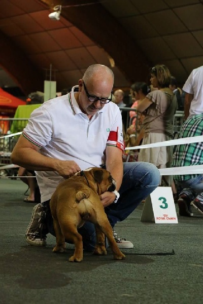 Fauve. 21 kg , exc construction, crâne large, beau dessin d'oreilles, bon lay-bac, machoir large, prognathisme correct, yeux sombres bien rond, membres avant bien avec pied ferme, bonne poitrine, ligne de dessus correcte , queue longue bien attachée, bon mouvements av et ar.