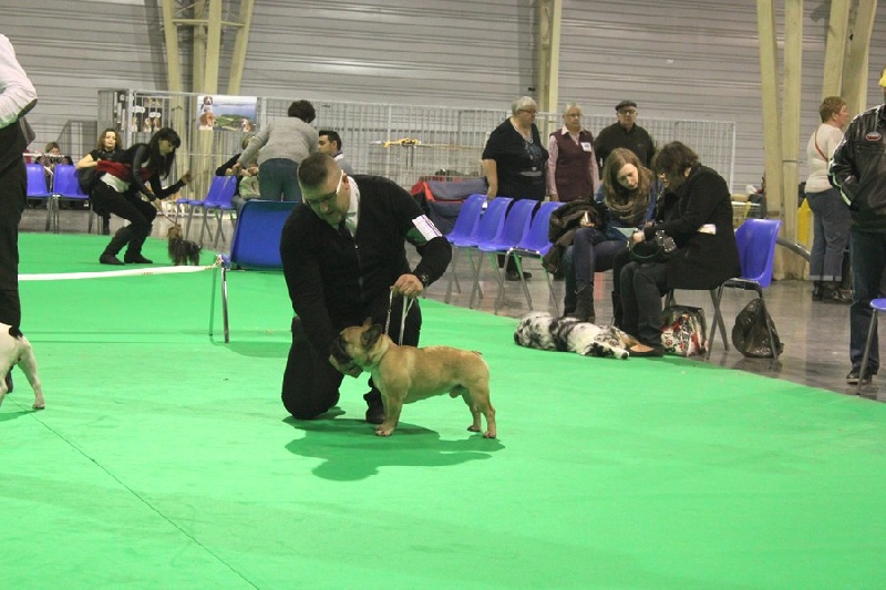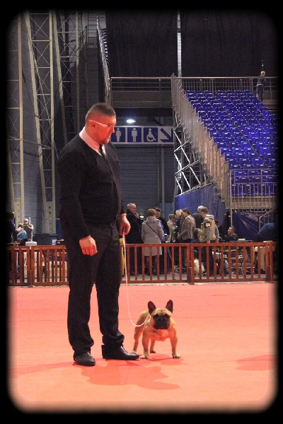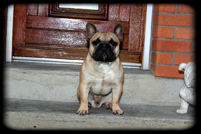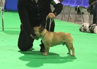 Dents en quinconce -Prognathisme pourrait être plus marqué -Narines bien ouvertes -Tête typique -Excellente expression + oreilles + ossature + Aplombs + poitrine dans ses 3 dimensions -Très bon dos de bouledogue -Angulation arrière correcte