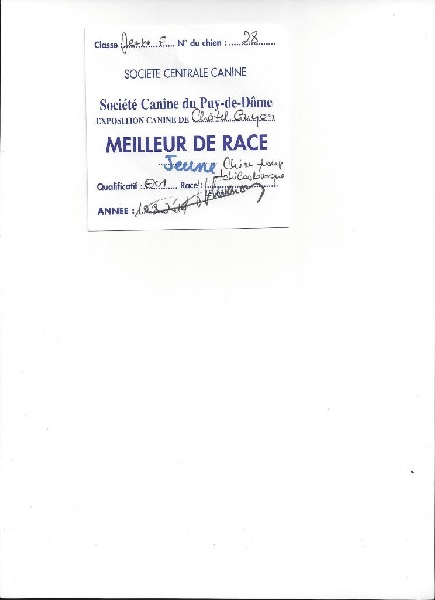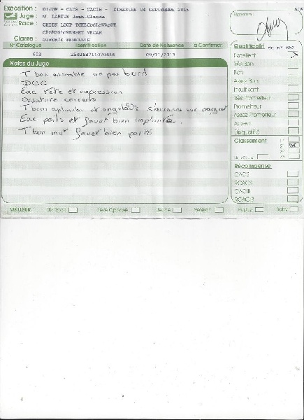 Tête : DCC, excellente tête + expression, Excellent ?il, forme et couleur, Excellente oreilles, bien portées.Corps : Très bonnes proportions, excellent dos, Très bonne croupe, excellente poitrine,Très bons aplombs, très bien angulés,Très bons mouvements et allures par intermittence ! BOB Jeune