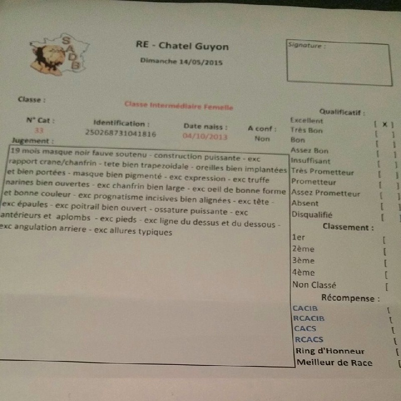 fauve intense Masque noire,excellente présentation.Tres belle tête Narines bien ouvertes Belles expressions oreilles bien portées Excellent prognathisme exçellente construction et ossature Bons aplombs et angulations avant et arrières fouet droit.Excellent en mouvement