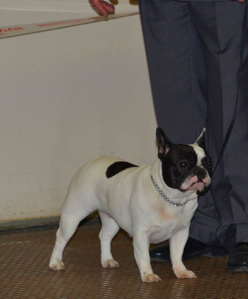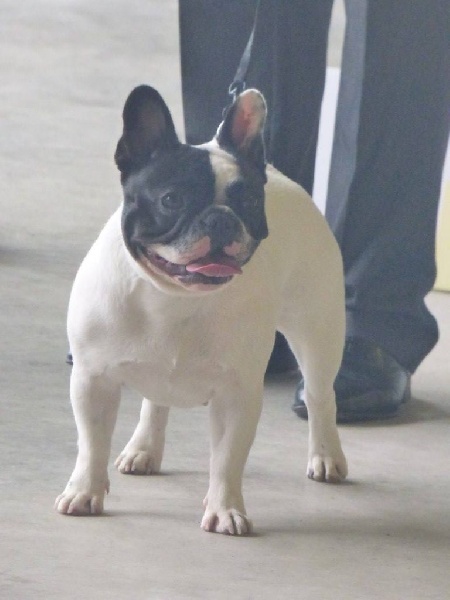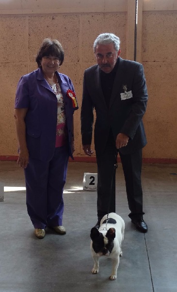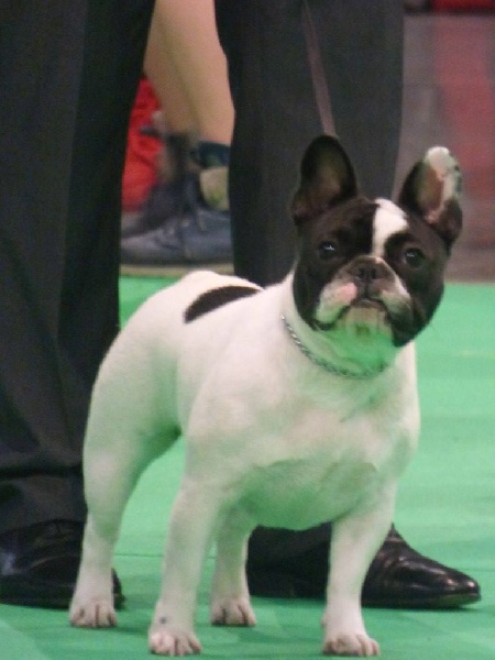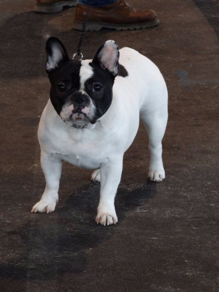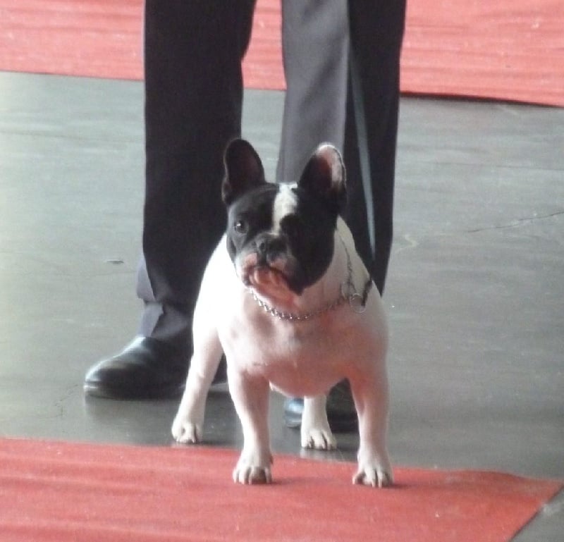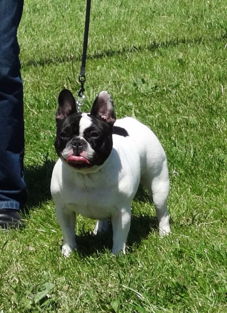 Très bon sujet , puissant petit format. Tête bien typée ,dentition correcte, narines ouvertes , lèvres épaisses. Dos large poitrine descendue .EX AV et ARM . Epaules musclées, pieds de chat.Mouvement typique. Très bonne présentation