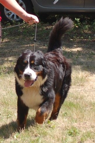 chien de bon type avec bonne tête yeux fonce bon angle avant pourrait en avoir + bonne ossature bon corps fouet trop court belle couleursbonne démarche bon caractère