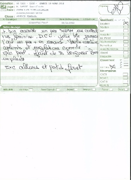 Apparence correcte, juvénile dans l'aspect.Tête bien féminine, masque bien présent, excellente forme d'?il.Oreille correcte, DCC, ligne de dessus correcte. Excellente poitrine dans sa hauteur. antérieur correct, port un peu serré.Mouvement correct