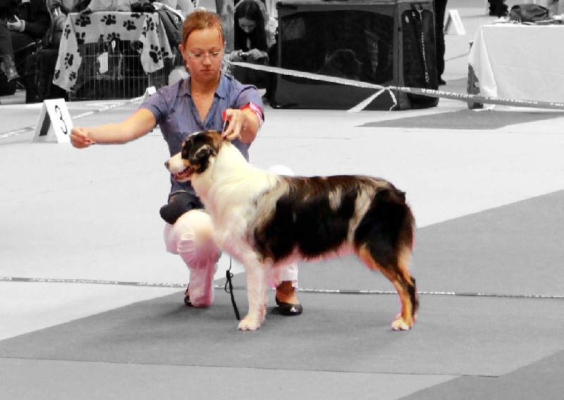 Grande chienne. Rein un peu long. Aplombs et angulations corrects. Tête proportionnée. Doit améliorer sa pigmentation. Excellents mouvements souples et amples.