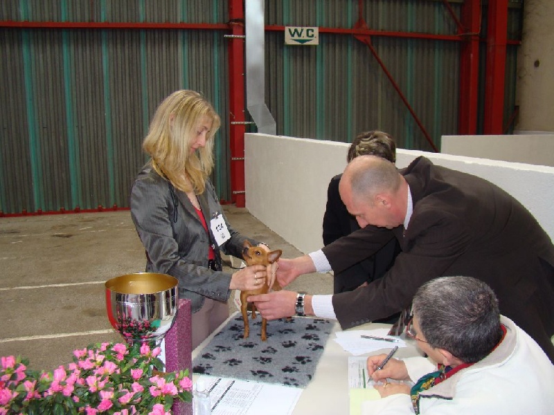 Classe puppy : "Excellent sujet, excellentes proportions, excellente tête, oreilles bien portées, excellents yeux, pigmentation et denture, excellentes épaules et avant main, excellente poitrine et ligne de dos, excellente attache de queue, excellents postérieurs, excellente robe, excellente démarche dynamique"