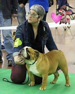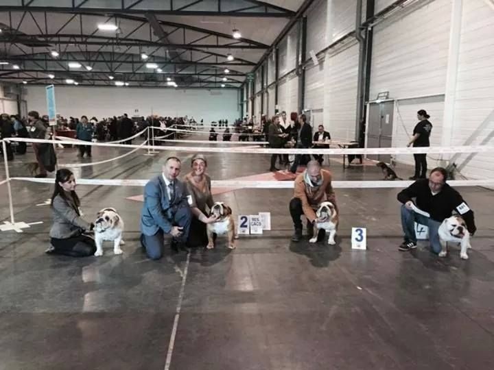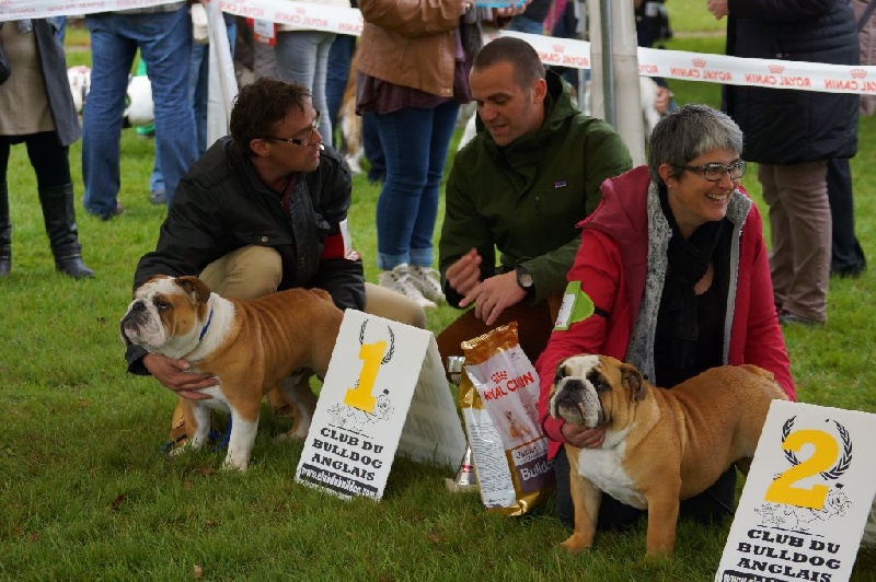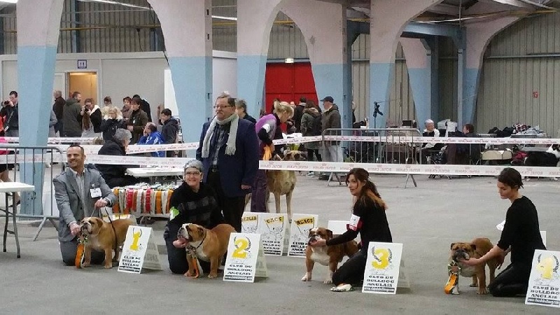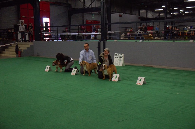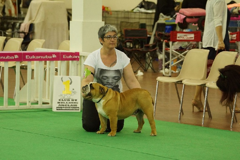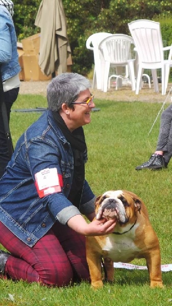 Fauve/rouge à panachures blanchesEn très bonne condition. Format un peu supérieur au standard. Bonne ossature. Tête avec une bonne expression typique. Bon crâne fort, large et carré. Stop bien prononcé. Bon chanfrein (museau)court et large. Babines bien épaisses. Bonnes rides fines. Bon cou. Bonne pigmentation. Bonne largeur de la mandibule. Bonne courbure de la mandibule. Incisives bien rangées. Yeux un peu trop ouverts. Bonnes oreilles en rose bien placées. Bonne ligne de dessus. Corps un peu long. Poitrine profonde et bien descendue. Bons aplombs avant. Bonnes épaules bien rapportées. Bons pieds. Bon arrière main. Bonnes angulations arrières. Queue attachée un peu trop bas. Bonnes allures typiques. Très bonne présentation. Excellente respiration. Chien sympathique.