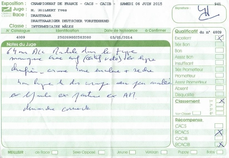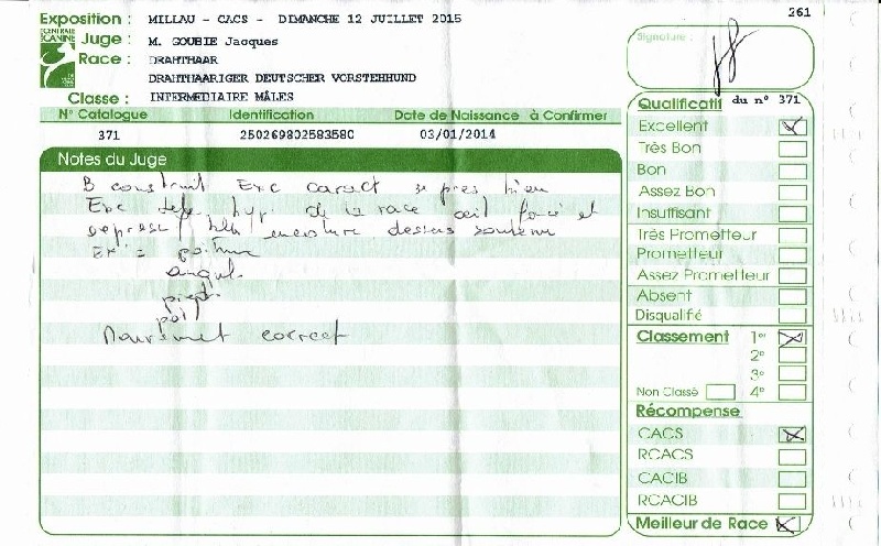 BIEN CONSTRUITEXCELLENT CARACTERE SE PRESENTE BIEN EXCELLENTE TETE TYPEE DANS LA RACE OEIL FONCE ET EXPRESSIF BELLE ENCOLURE DESSUS SOUTENUEXCELLENT POITRINEEXCELLENTE ANGULATION EXCELLENT PIEDSEXCELLENT POILMOUVEMENT CORRECT CACS MEILLEUR DE RACE 1ER