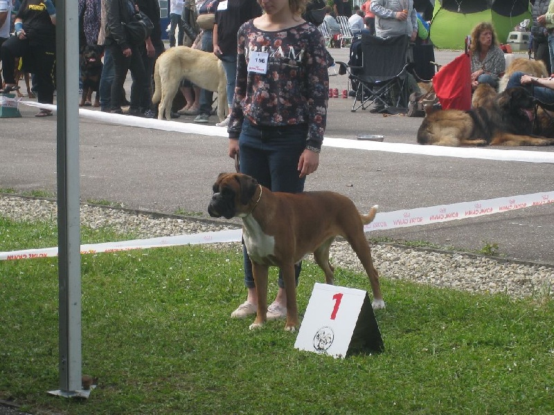 Excellente mâchoire largeExc type en tête avec oreille bien attachées et portées Belle encolureExc développement exc dessus court et bien tendu en statiqueExc ouverture de poitrineB oss et tb applombs1ère EXCELLENT CACS