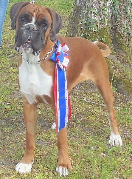 Crane carré ainsi que le museau, ?il foncé ,masque correct, incisives bien alignées, garrot marqué ,B proportion corporelles Ex cotes et poitrine,av et arr main correct.1ère EXCELLENT C.A.C.S. MEILLEUR DE RACE FAUVE.
