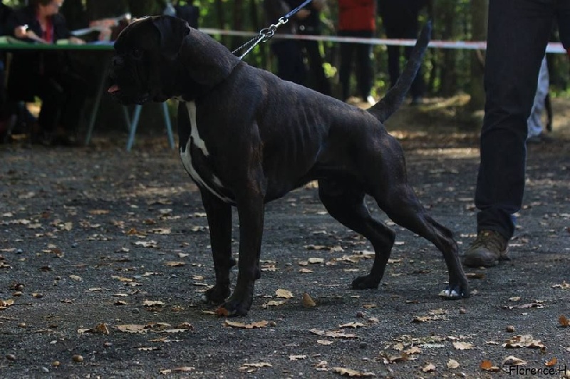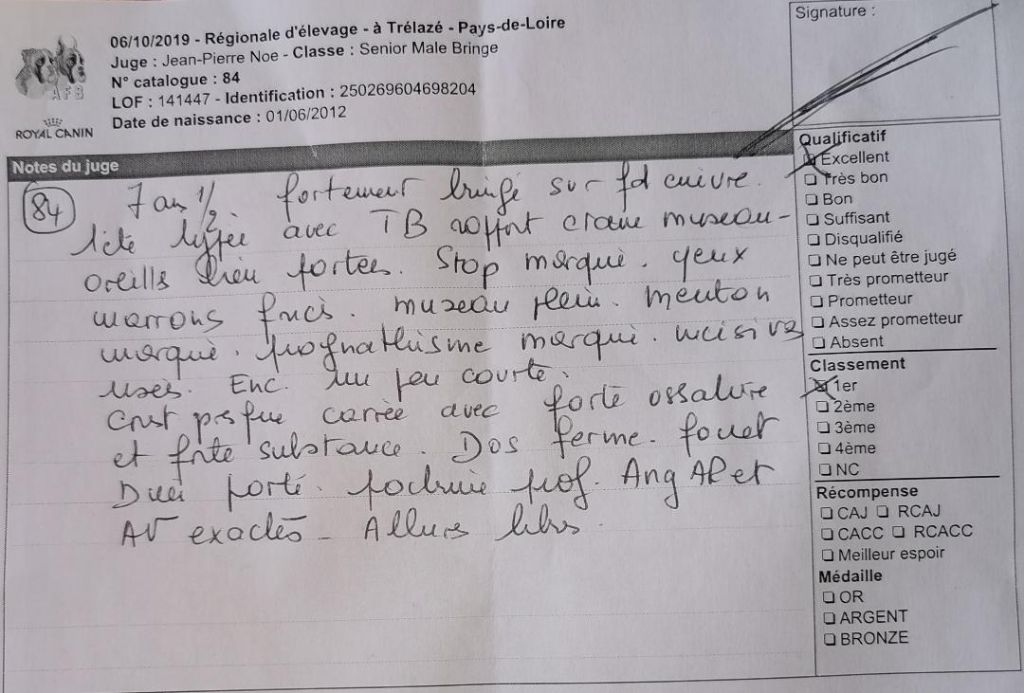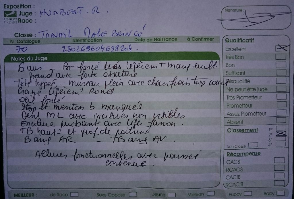 6 ans Puissant avec une excellente ossature, énorme poitrine. Excellent dos / B Ang. Ar et Av / Encolure puissante légèrement chargée. Jolie tête, yeux noire. Exc volume de museau / truffe bien remouchée / chanfrein un peu court. Denture correcte, prognathe, joues un peu marquées. Ex Allure