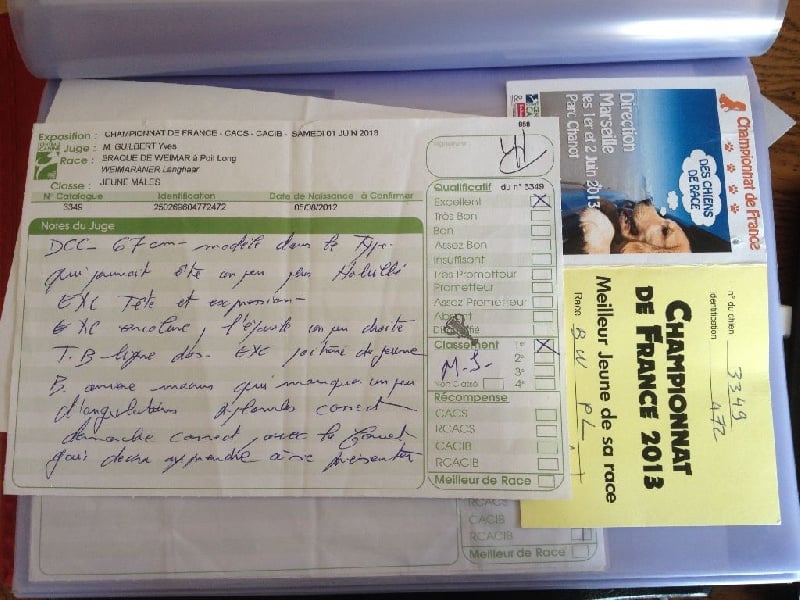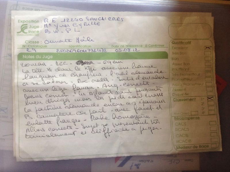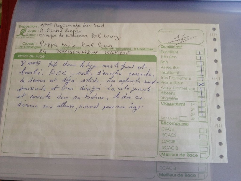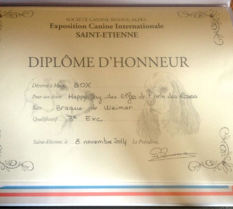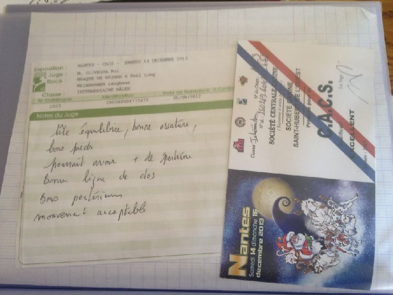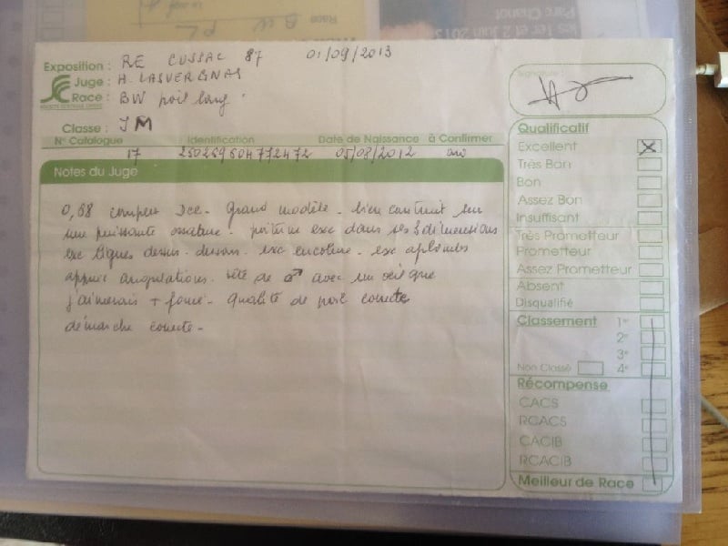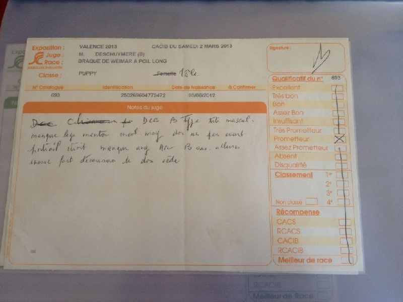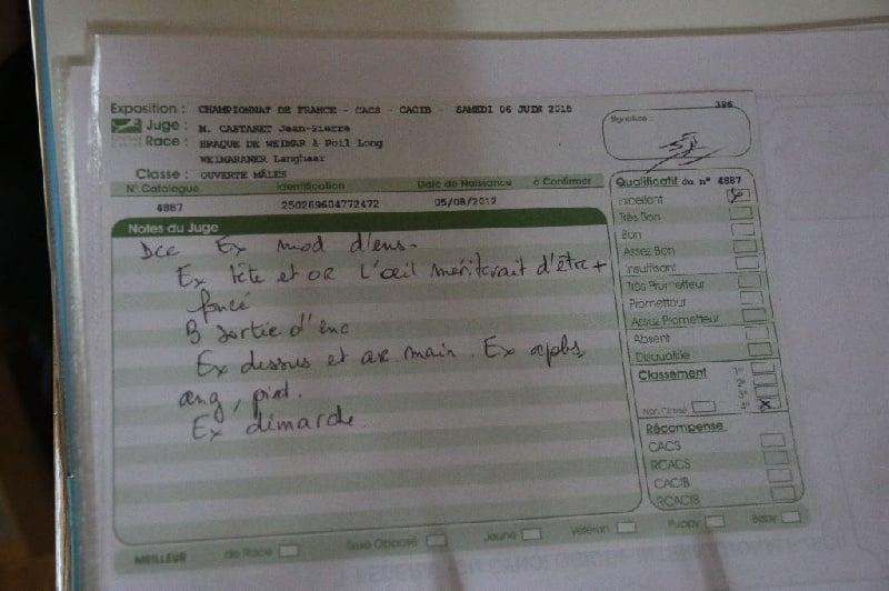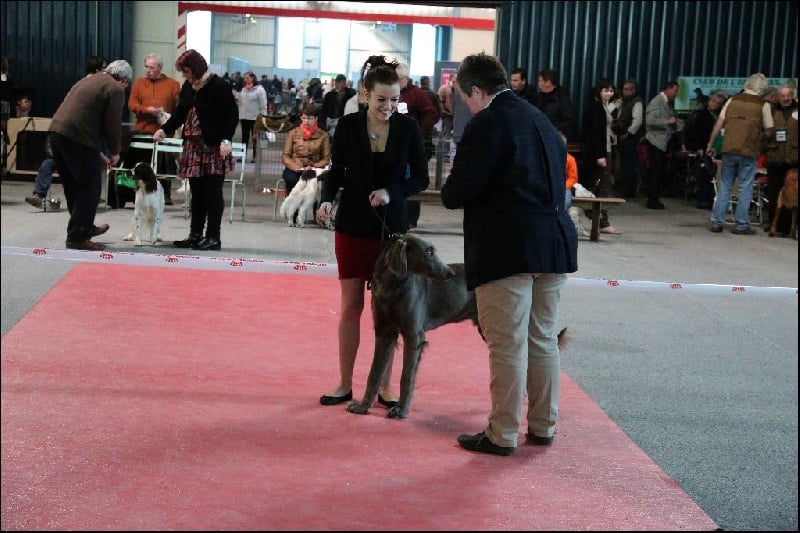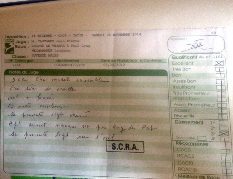 Commentaire oral du juge :"C'est un chien qui chasse et ça se voit. Un chien qui chasse n'est pas au mieux de sa condition physique en pleine saison pour les expositions canines".Et bien moi je dis, merci monsieur le juge d'avoir prêté cette attention et de le dire à voix haute, c'est le plus beau compliment que je pouvais avoir de la part d'un juge. Car oui, je me donne la peine de faire travailler mes chiens.En effet Happy est très sec à cette période!