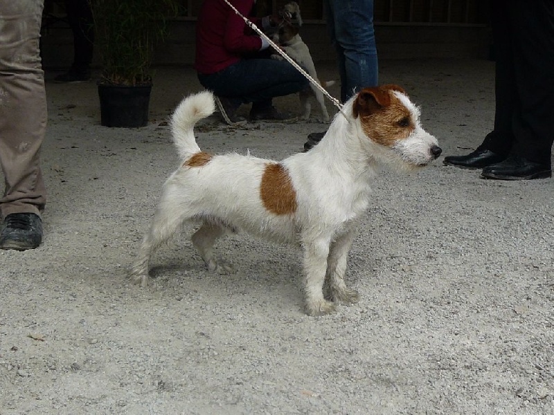 CLASSE JEUNE MALE. DCC T: 27cm TP: 40cm. Joli modèle, poil dur blanc/orange avec quelques mouchetures en arrière main. Excellente tête, oreilles, oeil. Bonne ossature, chien un peu long.
