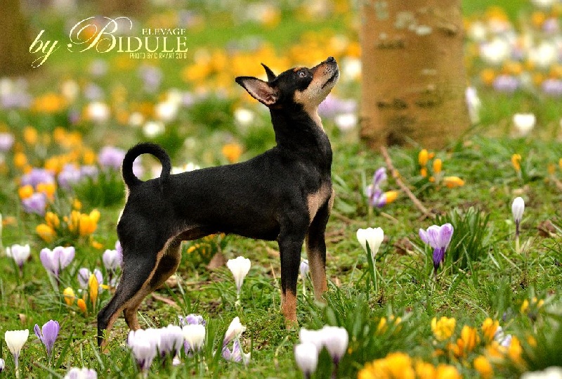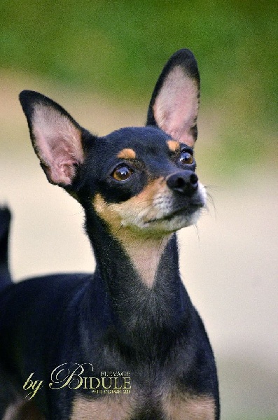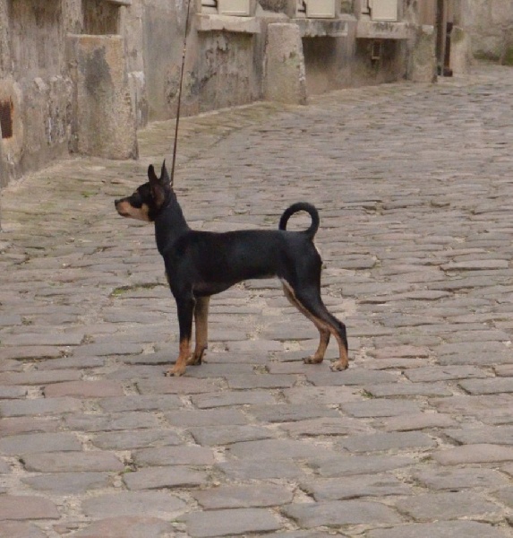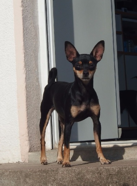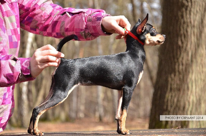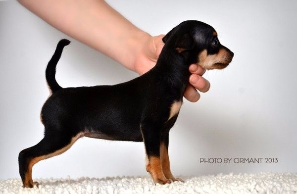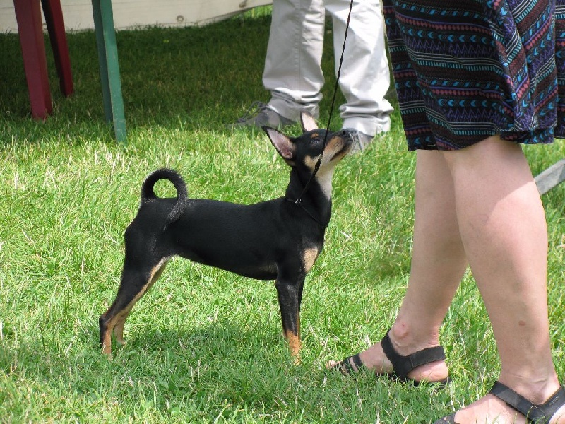 Noir et feu. Feux bien marqués. Très jolie tête avec excellente expression typique. Oreilles grandes et bien placées. Excellent rapport crâne chanfrein. Excellente encolure. Dos bien soutenu. Excellent qualité de poil. Antérieurs bien parallèles. Excellente construction. Fouet bien inséré. Excellente musculature. Joli sujet avec excellente présence dans le ring. Excellents mouvements.