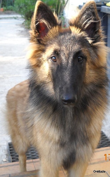 Denture complète en cisaille, femelle typique bien féminine fauve charbonnée. Encolure bien dégagée. Bonne ligne de dos. Bien angulée à l'arrière, modérée à l'avant. Tête bien masquée. Bel oeil sombe de bonne forme. Crâne plat, stop modéré. Oreilles haut portées. Belle présentation attentive, bonnes allures de jeune.