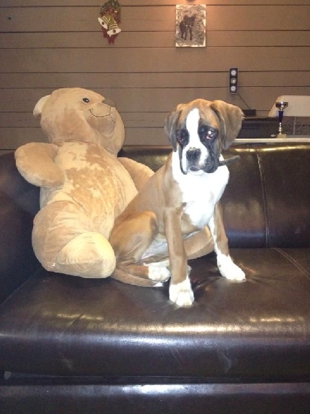 Fauve marqué en blancTB type de tête avec crâne hautTB volume de museau Denture largeEncolure degagéeTB sortie de poitrailB haut et prof de poitrineConstruction carréAngul AV/AR correctes