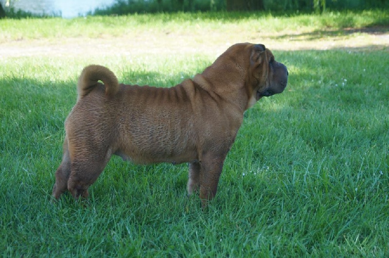 Faya est une chienne de taille moyenne avec une robe fauve rouge à poil brush coat, les oreilles en tulipes, une queue bien positionnée à l'arrière et enroulée sur le dos, bien proportionnée et conforme aux critères de la race.
