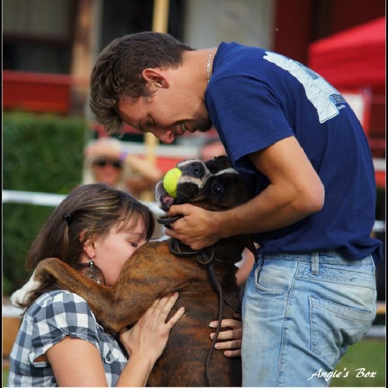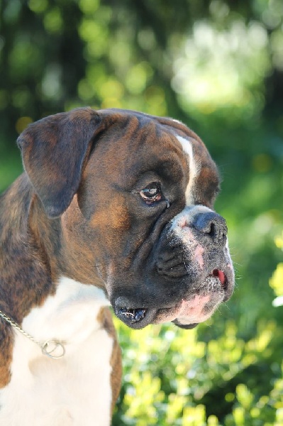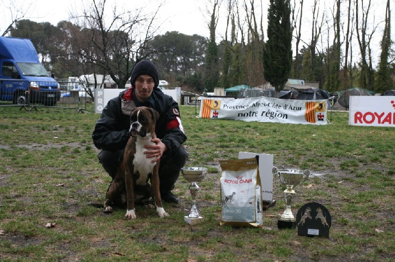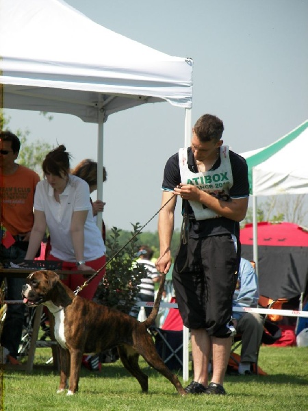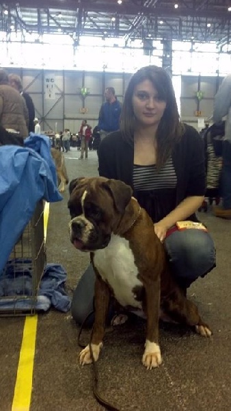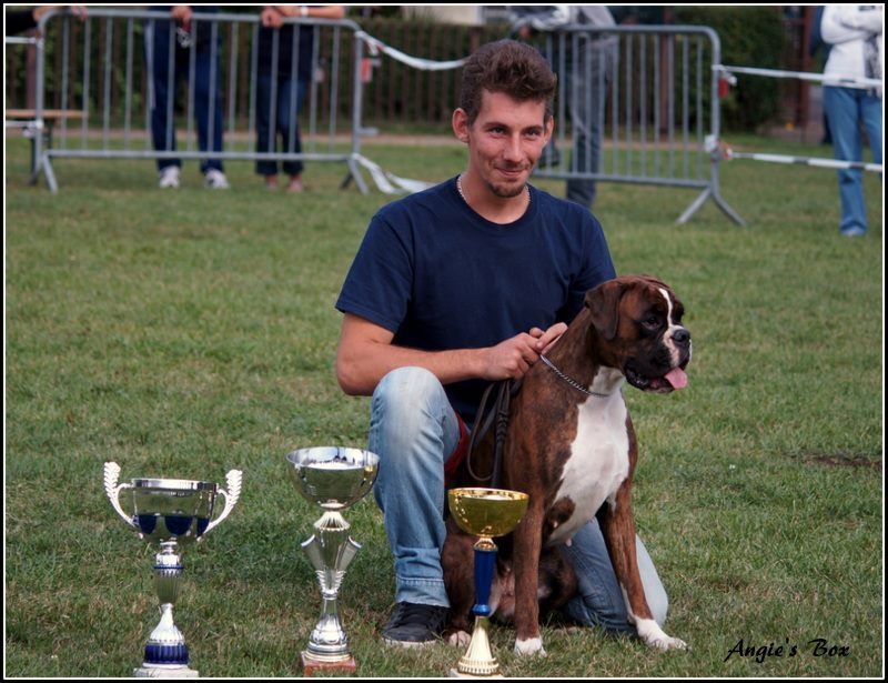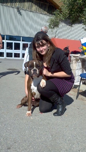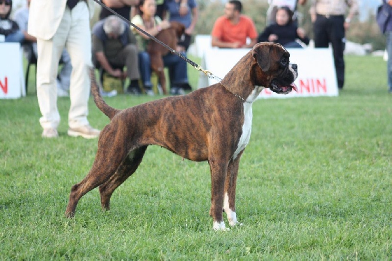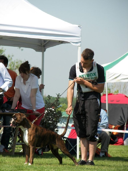 14 mois, bringé sur cuivre marqué en blanc, Exc type de têtemalgré un crâne un peu fort, Exc yeux pour la couleur, légère-ment ouvert, denture large, droite avec 1 exc prognathisme,Truffe large, menton marqué, Exc sortie d'encolure longue etnoble, construction carrée, montante avec Exc dos et croupe,Exc angulations avt/arr., Exc allures couvrantes avec une trèsforte poussée.
