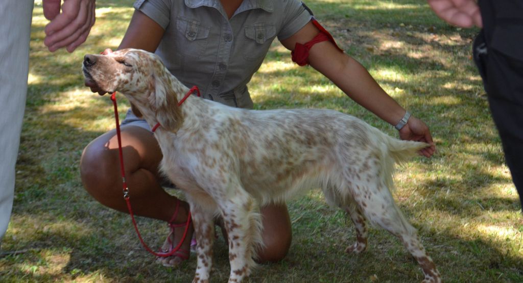 55 cm, type sportif, tête bien setter, excellente sortie d'encolure, très bonne ligne de dos, excellentes poitrine et angulations avt et arr.,belle soie, n'est pas mise en valeur en statique, à la démarche, la ligne de dos nécessite d'être plus tendue.