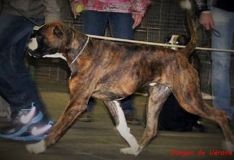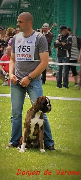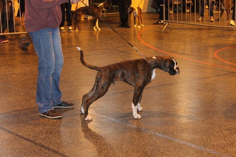 Pies 9 miesieczny,kwadratowa budowa ciala, ciemne oko, nieco nizej i glebiej osadzone, nieco dluzszy nos, ale glowa wciaz w rozwoju, w tej chwili lapy sa wciaz miekkie bardzo wydajny w ruchu, krowia pastawa konczyn tylnych i zbyt cienkie peciny.Ippon a été sorti à la huitiéme place au championnat du monde boxer!