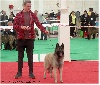 DCC(denture complète en cisaille), pigmentation noire, sable charbonnée, bonne corpulence, tête médio un peu triangulaire bien masquée, crâne plat, stop modéré, excellent parallélisme, ciselure moyenne, excellents yeux sombres expressifs, oreilles moyennes isocèles bien portées, léger manque de menton, encolure dégagée, garrot marqué, dos doit se tendre, excellente croupe large, excellente poitrine dans les 3 dimensions, excellent poitrail, excellentes angulations, excellente ossature, aplombs parallèles, légère faiblesse des poignets, pieds ovales et compacts, bonnes allures, s'affaisse un peu sur l'avant, fouet bien porté, excellente présentation fière, des qualités de lice.