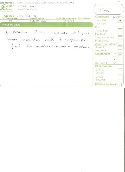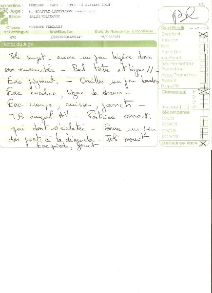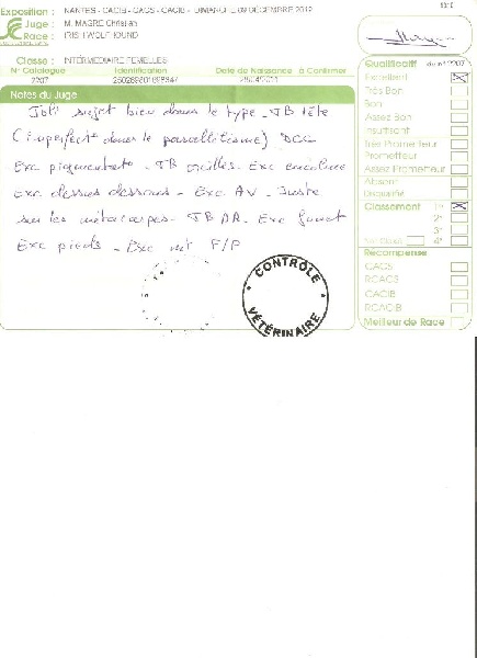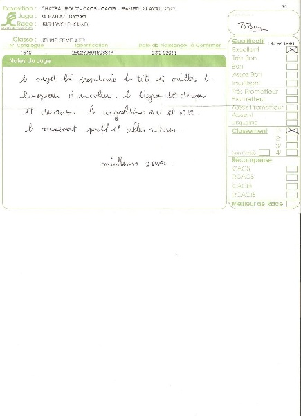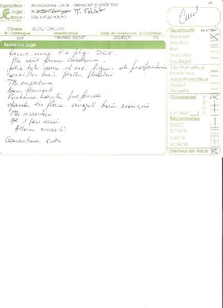 Jolie sujet bien dans le type. Très bonne tete [imperfection dans le parrallélisme] DCC. Excellente pigmentation, très bonnes oreilles. Excellente encolure. Excellent dessus dessous. Excelent avant, juste sur les métacarpes. Très bon arrière. Excellent fouet, excellent pied, excellent mt F/P.