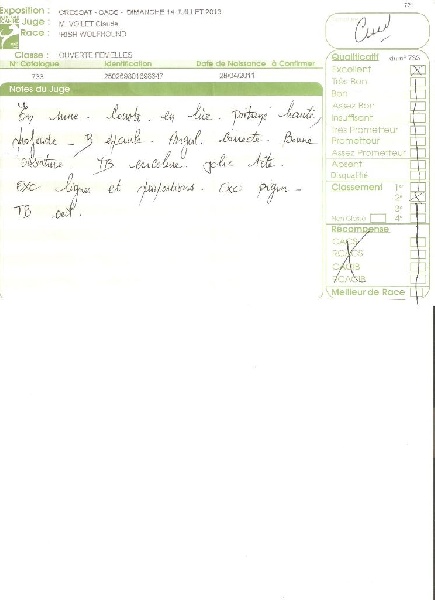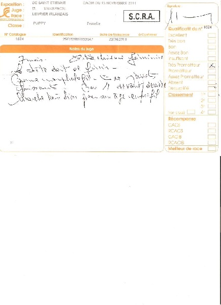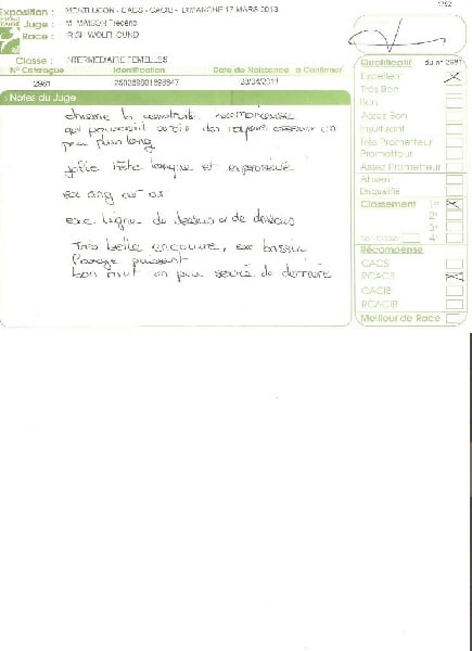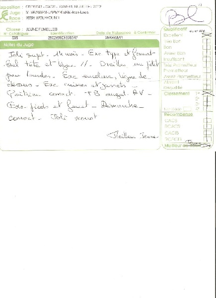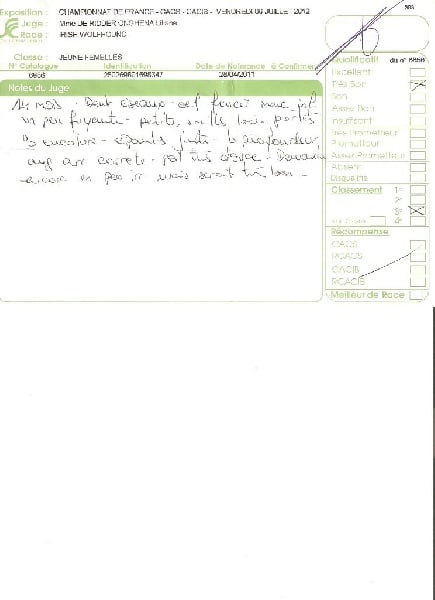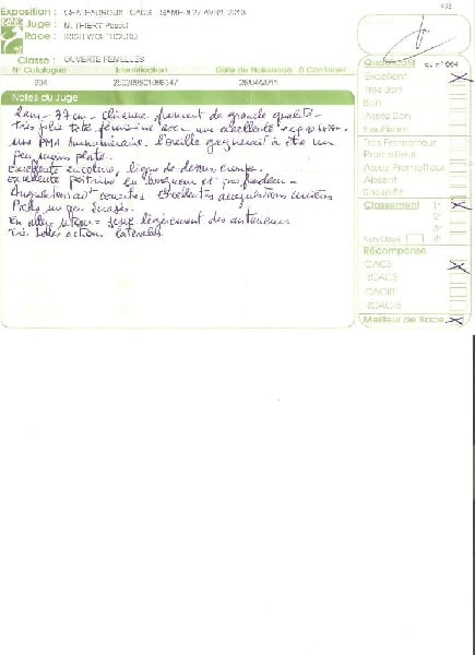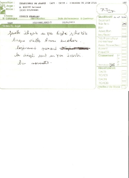 Classe ouverte : Jolie sujet. Encore un peu légère dans son ensemble. belle tete et ligne //. Excellent pigmentation. Oreilles un peu lourdes. Excellent encolure, ligne de dessus. Excellente croupe, cuisses, jarrets. Très bonnes angulations avant. Poitrine correcte, qui doit s'éclater. serre un peu des postérieurs à la démarche. Joli mouvement. Excellents pieds, fouet.
