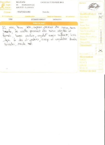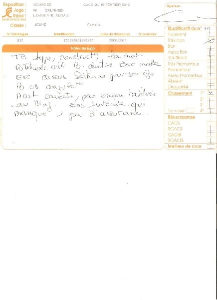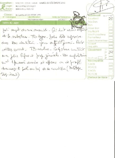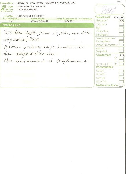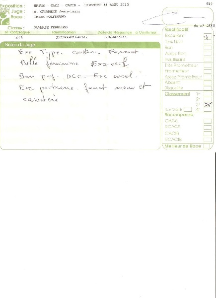 Classe ouverte : Excellent type, construction, format. Belle féminine. Excellent oeil. Bonne pigmentation. DCC. Excellent encolure. Excellente poitrine, fouet, mouvement et caractère.