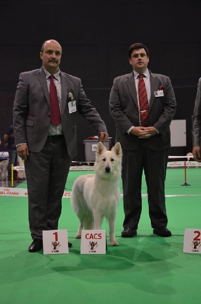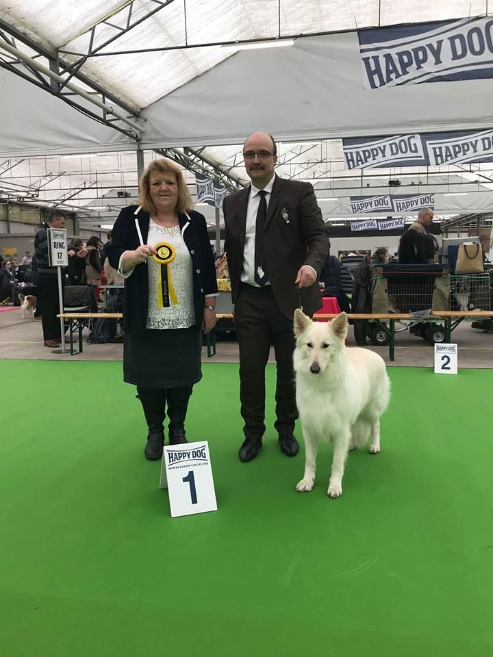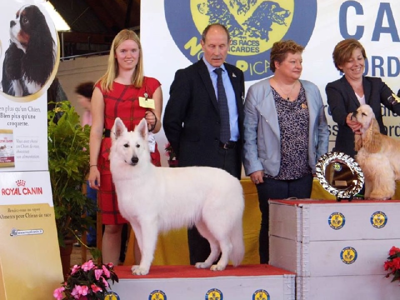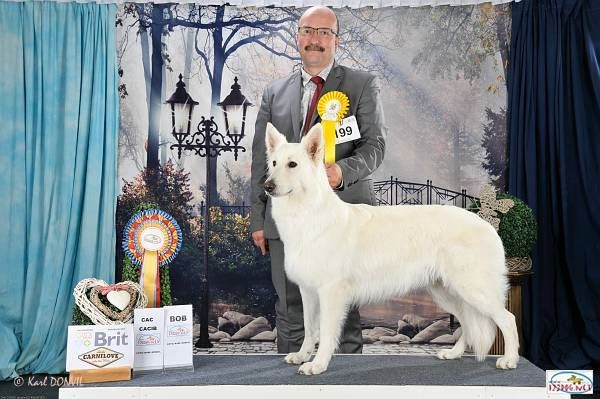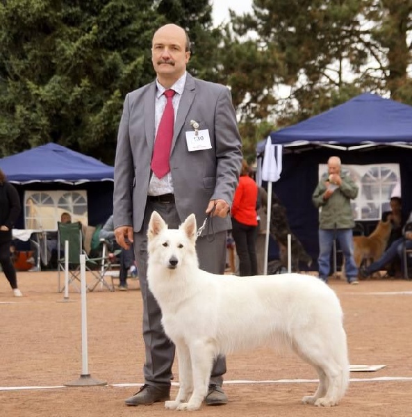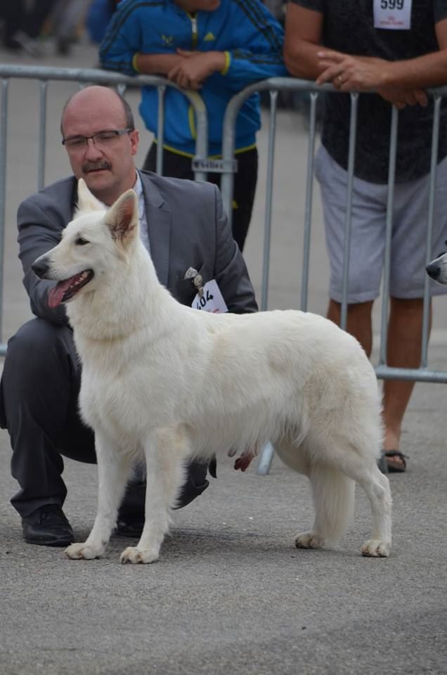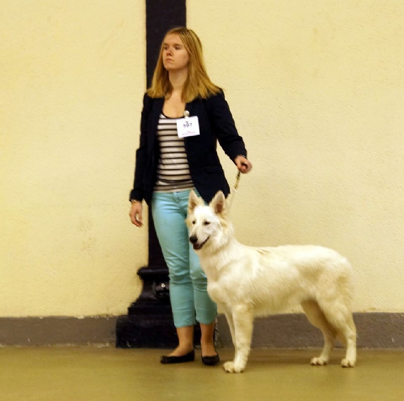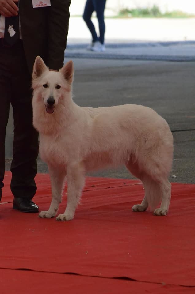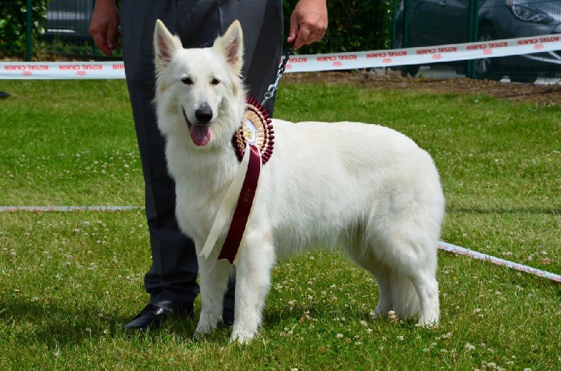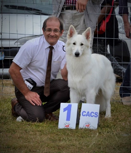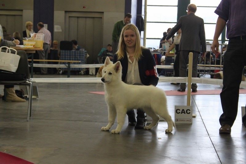 DCC, jolie tête, très belle proportion, excellents yeux, très belle pigmentation, oreilles bien implantées, un peu écartées, belle pigmentation des muqueuses. Belle proportion, excellent dos assez tendu, belle croupe, excellente poitrine de bébé, très belle angulation et aplomb, très beau mouvement et allures de bébé