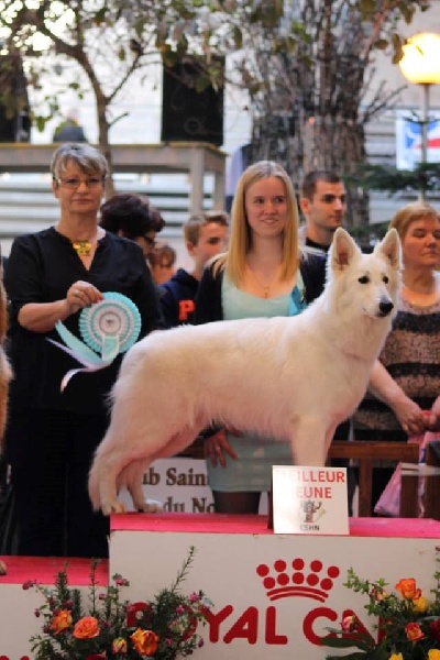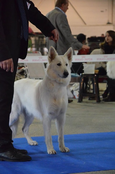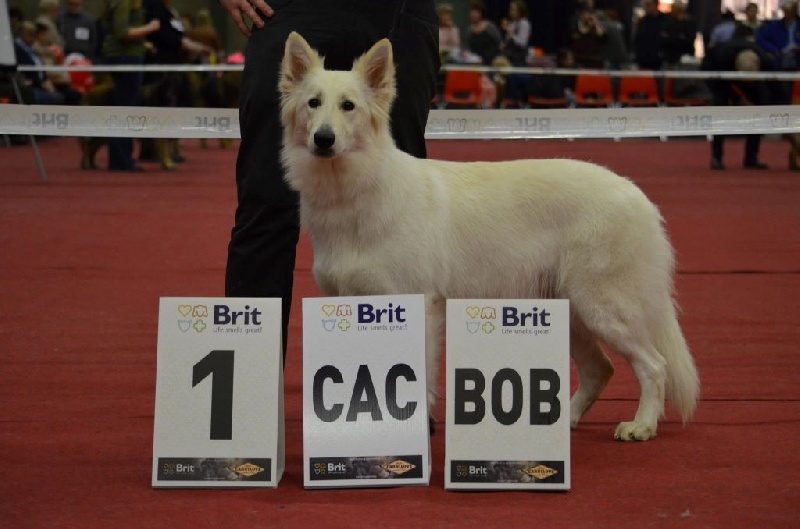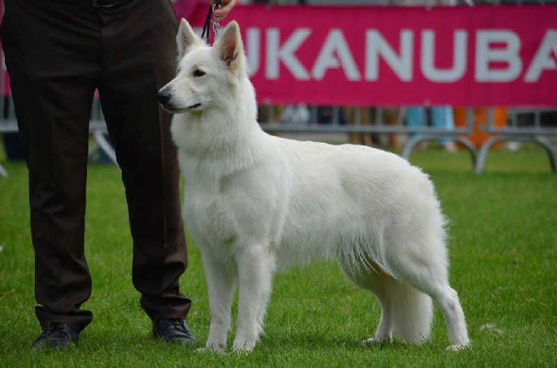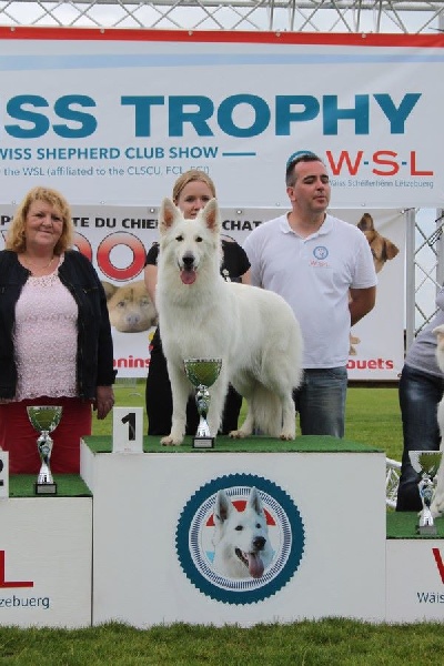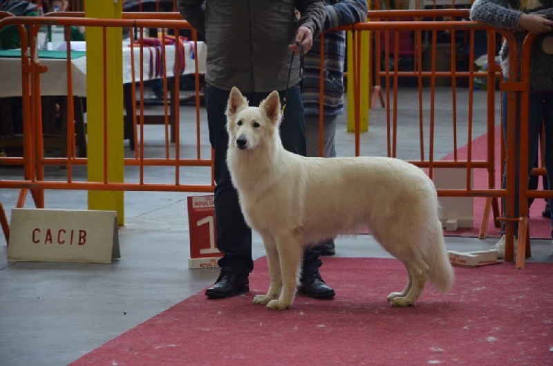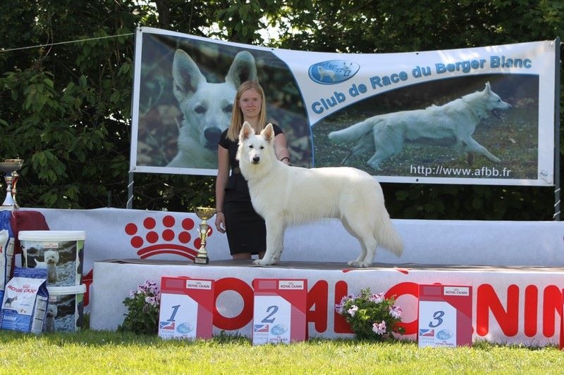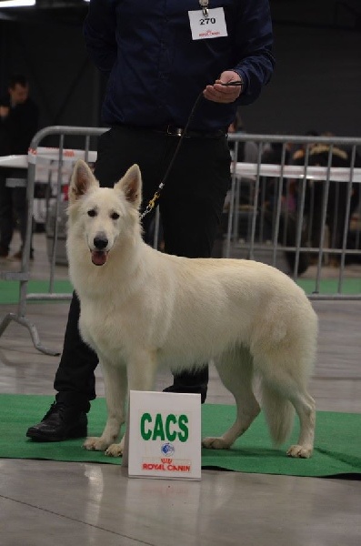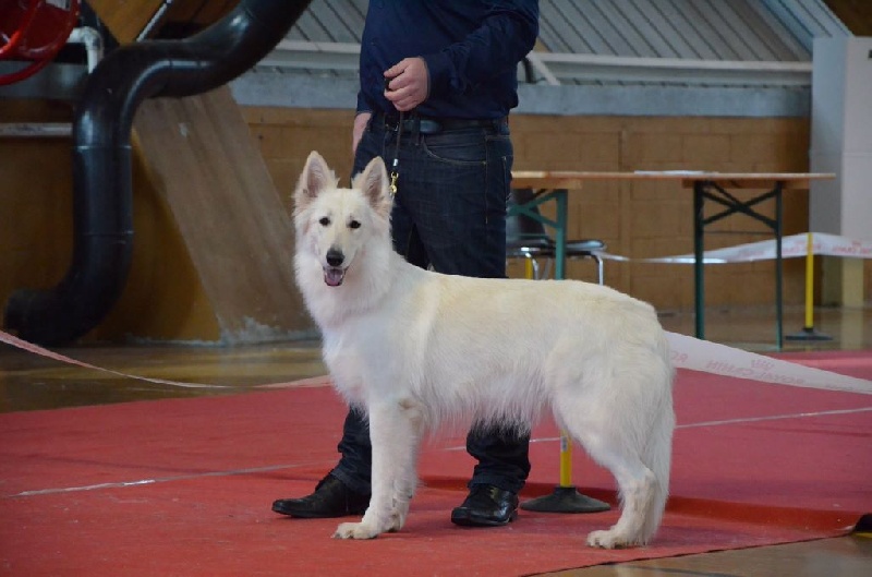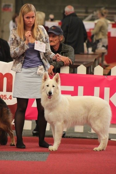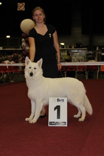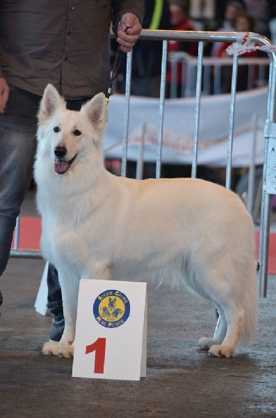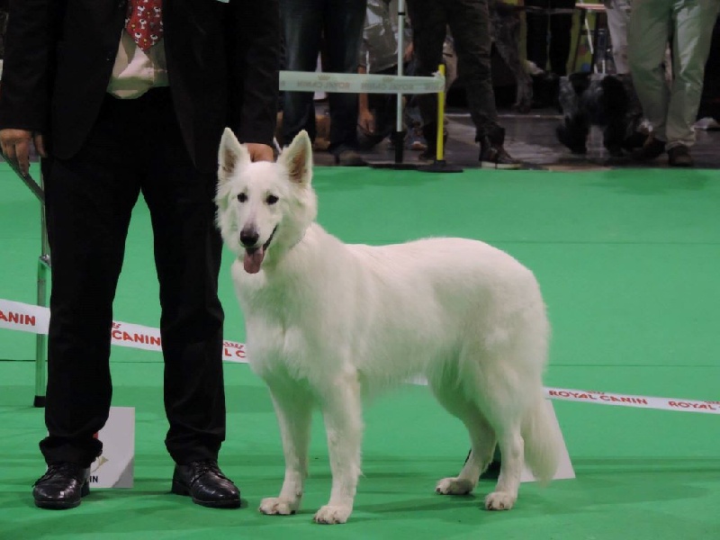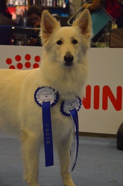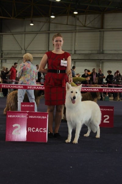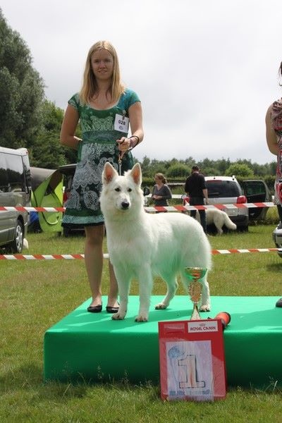 DCC, jolie tête, très belle proportion, excellents yeux, très belle pigmentation, oreilles bien implantées, un peu écartées, belle pigmentation des muqueuses. Belle proportion, excellent dos assez tendu, belle croupe, excellente poitrine de bébé, très belle angulation et aplomb, très beau mouvement et allures de bébé