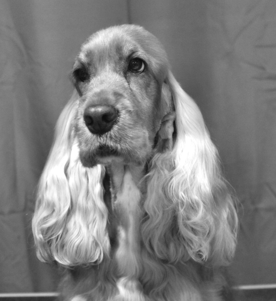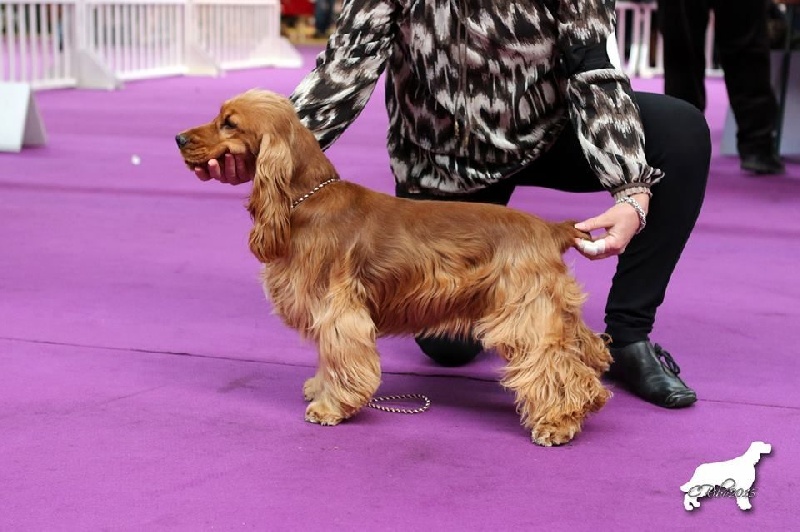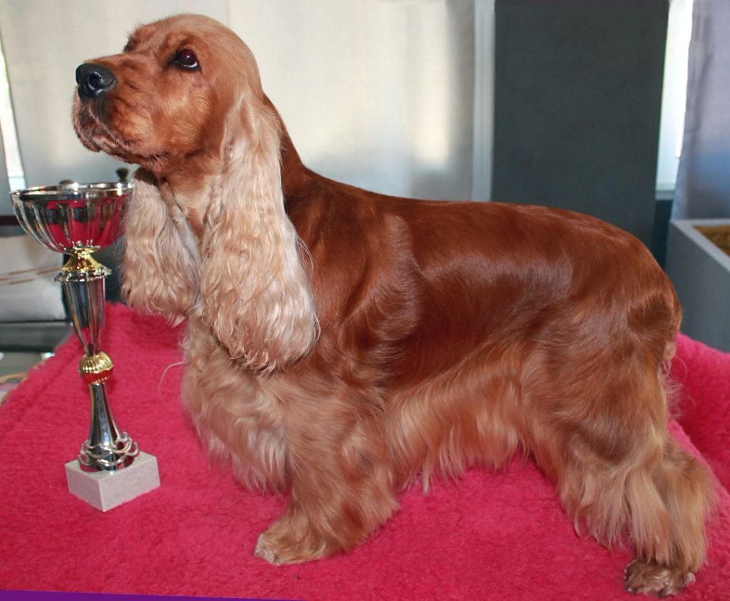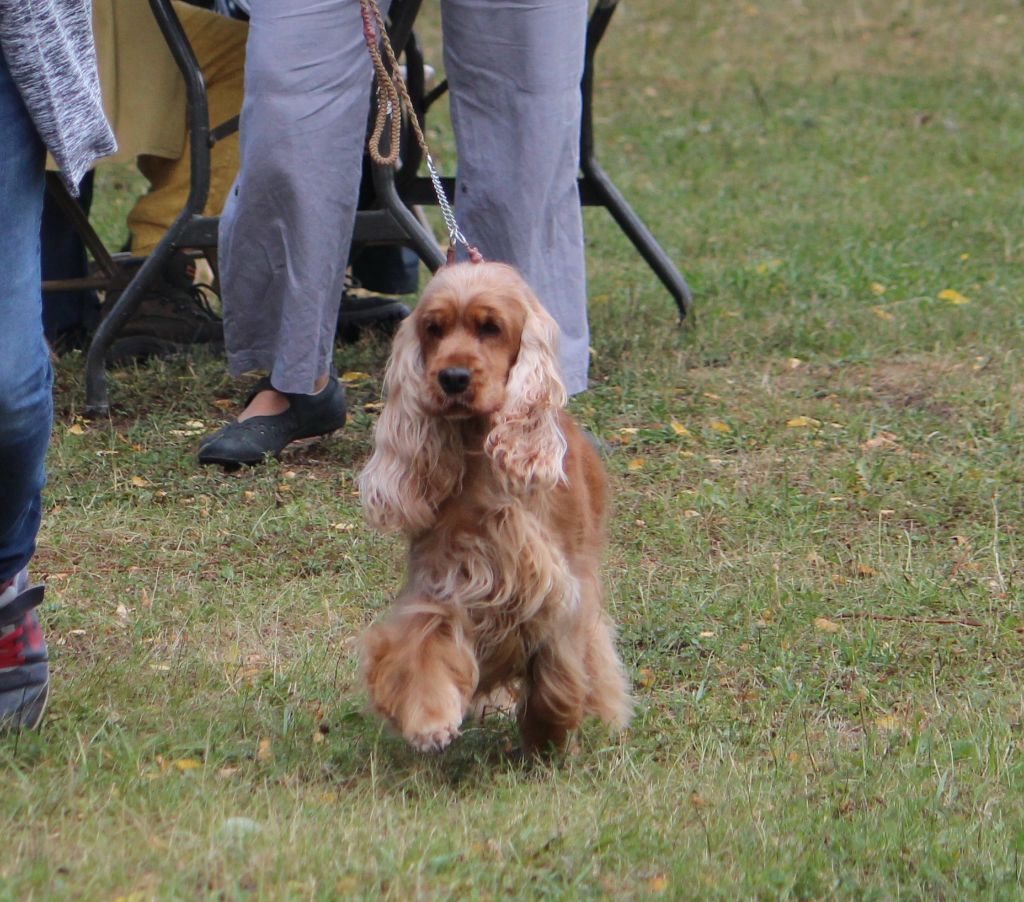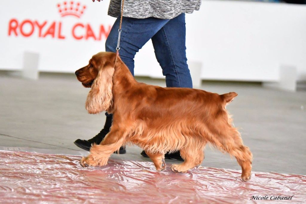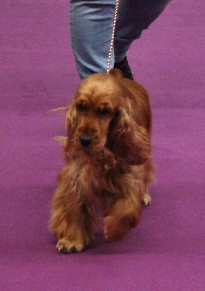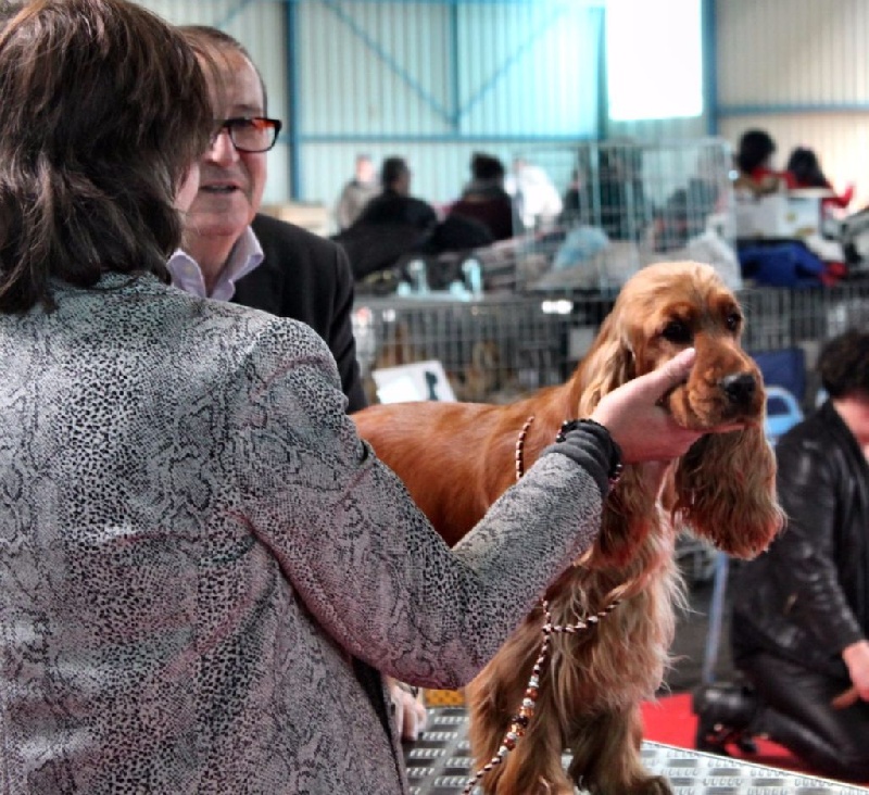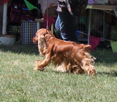 Excellent construction d'ensemble. Exc tête, exc ossature, pigmentation, attache d'oreilles, encolure, épaules, aplombs et pieds. Déjà une exc poitrine pour son âge. Exc corps, attache de fouet, arr.main, cuisse bien musclée. Exc couleur et qualité de fourrure. Exc mouvement et port de fouet, trés cocker, trés grouillant.8ème groupe jugé par Mr Rousset