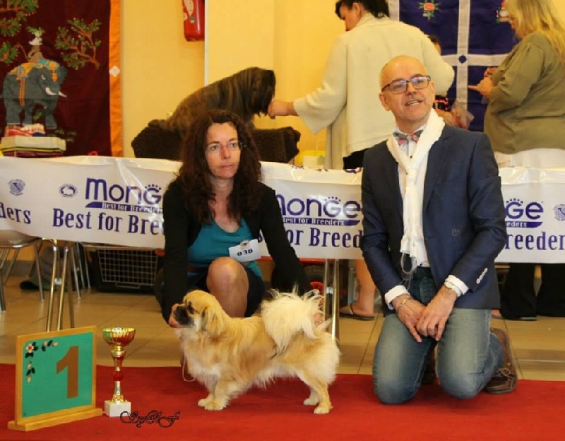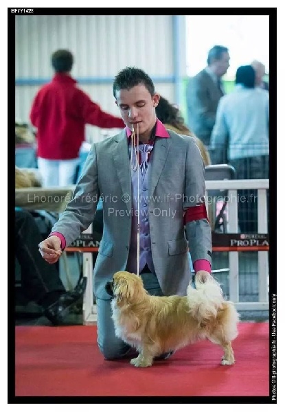 qualificatif : excellenten classe Jeune1er (S/1)meilleurs jeune et meilleurs de race 9 MOIS jolie silhouette, ext rapport H/Lgrexc forme tete et crane, exc attache oreille, exc yeux, exl museau, prognate dentition clpt, ex épaule et ant, pieds de lievre, exc poitrine encore un peur d'air sous les condes, tb inse de queue, correcte les ang ar exc fourrure, exc démarche , av et ar.