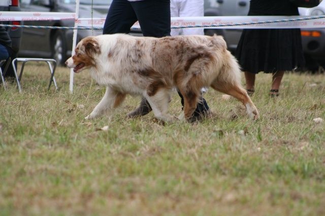Joli sujet, excellent type et format, belle tete, oreilles portées un peu en arriere, excellente encolure, ligne de dessus, croupe, cuisses et jarrets, excellente angulation, poitrine un peu juste, écarte un peu les postérieurs a la démarche, joli mouvement.