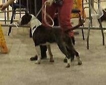 Well marked 6 monts brindle nice dog. Straight front, sweeping profile lots of fill' good rear quarters,move ok front close behind.