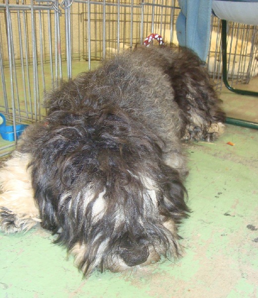 9 mois, tête puissante avec bon rapport crâne chanfrein, yeux foncés, DCC, bonne ossature, poitrine bien cerclée et bien descendue pour son âge, bon dos, bons applombs avant et arrière, le blanc est limite, allures bergères, mais qui manque encore d'amplitude, chienne un peu timide, le travail de socialisation doit se poursuivre.