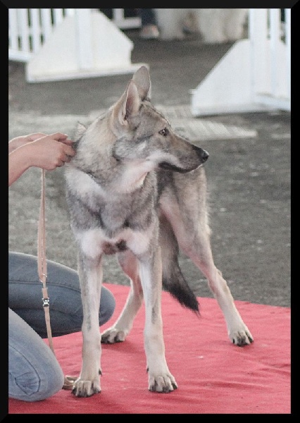 Bon gabarit, bien proportionnée, bonne ligne de dessus , excellente poitrine, excellent avant-main, très jolie tête lupoïde avec lèvres sèches, les marques blanches ne sont pas assez accentuées.