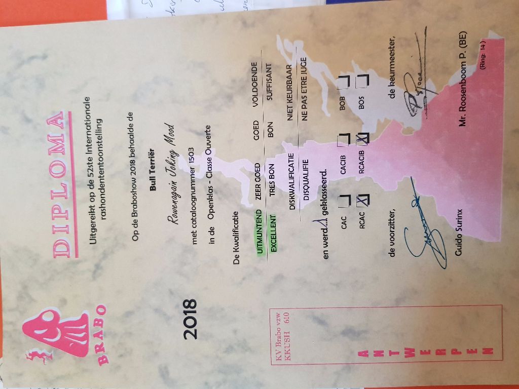 18 mois, mâle puissant avec une excellente proportion de têteExc oeil et denture, exc ligne de dessus et insertion du fouetForte ossature, exc ongulations et aplombsexc cage thoraciqueexc mouvement qui pourrait être plus dynamique, manque d'habitude de ring Ne se présente pas à son avantage
