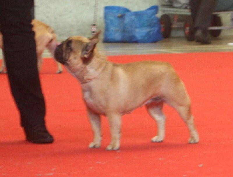 Jolie tête un peu chargée en rides, bon profil, bonne forme des yeux et couleur, DCC, bonne arrière main, bon pied, bonnes épales, bonne ligne de dos correcte, queue courte, excellent musculation, bonne démarche et présentation