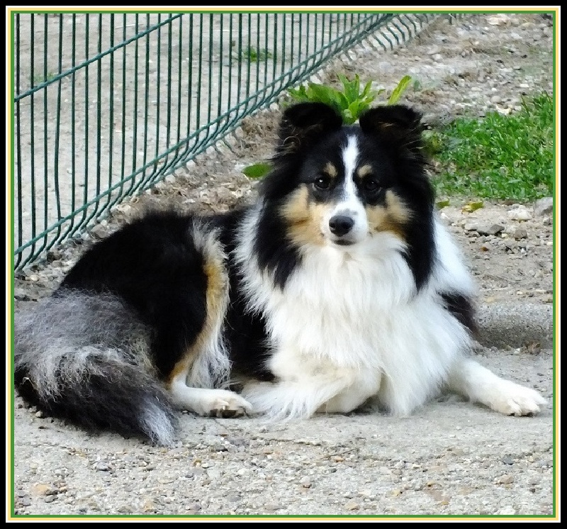 GUESS TRES JOLIE SHETLAND TRICOLORE, bon format et bien fournie en poil, est une chienne très gentille mais très bonne gardienne .