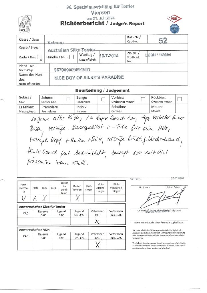 - 1 Exc (Vet)/Vet CAC(VDH+KFT+IB)/Vet BOB/ GERMAN VET WINNER