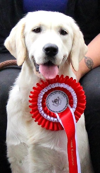 Trés bon type , bonne tête , expression douce . Excellente pigmentation , excellente encolure, ligne de dos et attache de queue . Trés bonne angulation avant et arrière . Corps bien dévelloppé . Pas de sous poil aujourd'hui . Trés bonne ossature . Pieds pas toujours corrects . Trés bon mouvements .