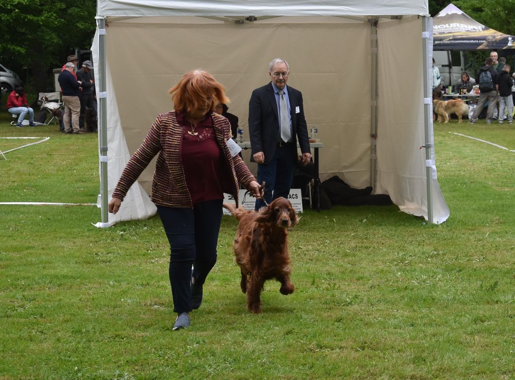 DCC, joli modèle bien construit avec une tête bien irlandaise, l'oreille est typique de la race, l'oeil bien pigmenté, belle sortie d'encolure, esc. dessus, exc. poitrine , le fouet est bien attaché et de bonne longueur, démarche correct