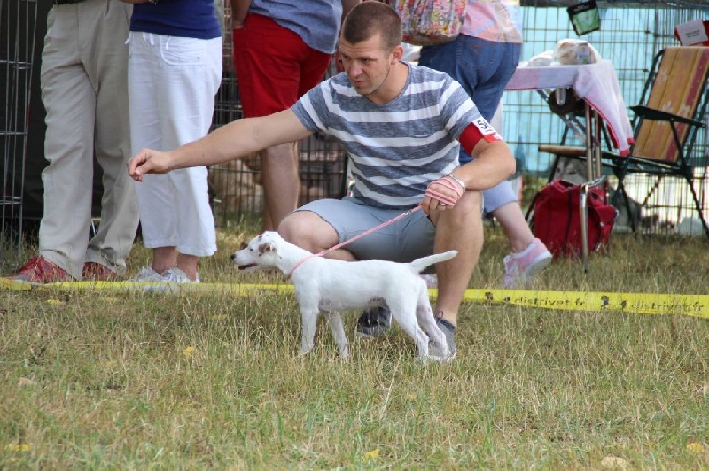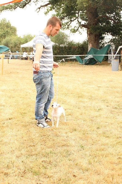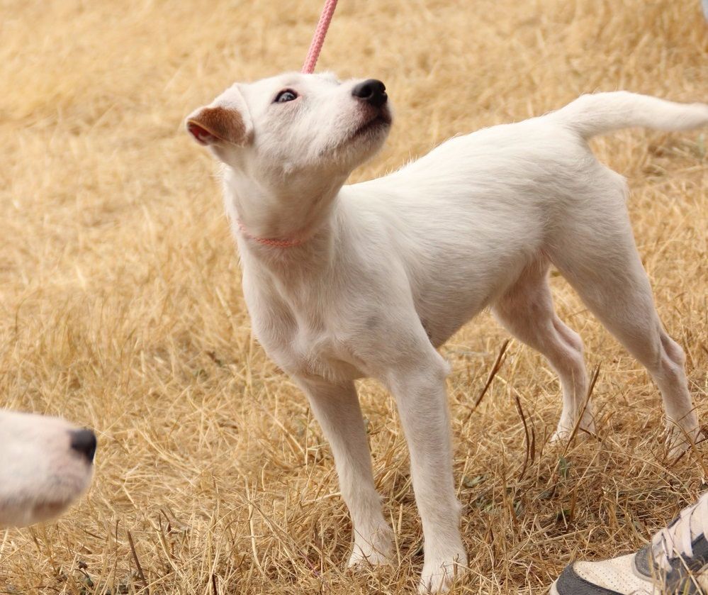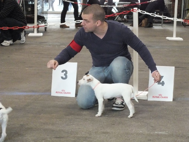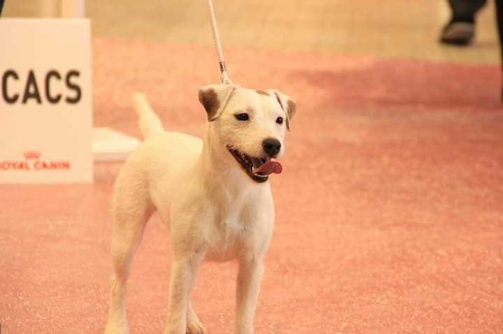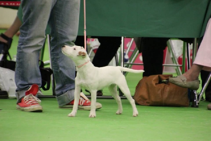Heuteur 32 cm, Tour de poitrine: 38cm, Blanc et Orange, Excellente oeil noir, DCC, Excellente pigmentation, belle encolure, très bonnes épaules, attache de fouet, applombs et ligne de dos. Excellente arrière main, marche très bien, excellent caractère" 1er EXCELLENT classe jeune femelle, MEILLEUR JEUNE