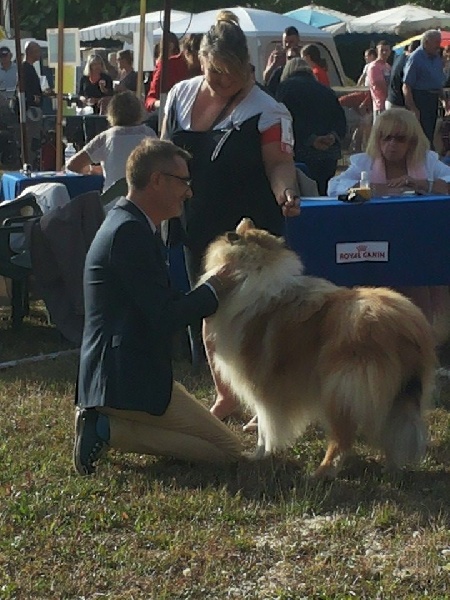 Superbe sujet - Exc chanfrein- Beaucoup de douceur dans l expression- Tres bel oeil sans avoir une expression de geisha - Oreilles bien implantées mais cassé a 1/2 - 1/2. Tres belle sortie d encolure, un vrai medio ligne sans exces-Bon membres - Exc fourrure- Bon dos , croupe bien descendue- le fouet est tres tres gai.