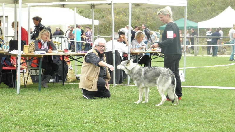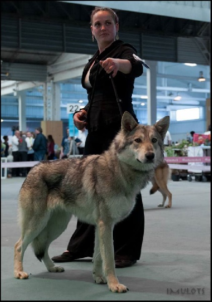 Gris loup,de bon gabarit.Se présente avec beaucoup de réserve.Jolie tête.DCC crâne un peu large,poil est un peu fin et doux aux touché.Exc dessus dessous fouet.ang avant correct et arrière.