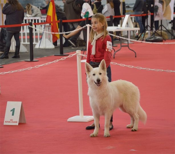 présentée par ma fille de 9 ans / DCC, 3 ans, bonne taille, bonne encolure, petite faiblesse après le garrot, excellente poitrine, très bonnes angulations, ossature, aplombs et pieds. Jolie tête, belle oeil sombre. Bonne pigmentation, oreille de bonne forme, pourraient être portées plus serrées. Bon parallélisme en tête et stop. serre à l'arrière. bonnes allures latérales, fouet correct.