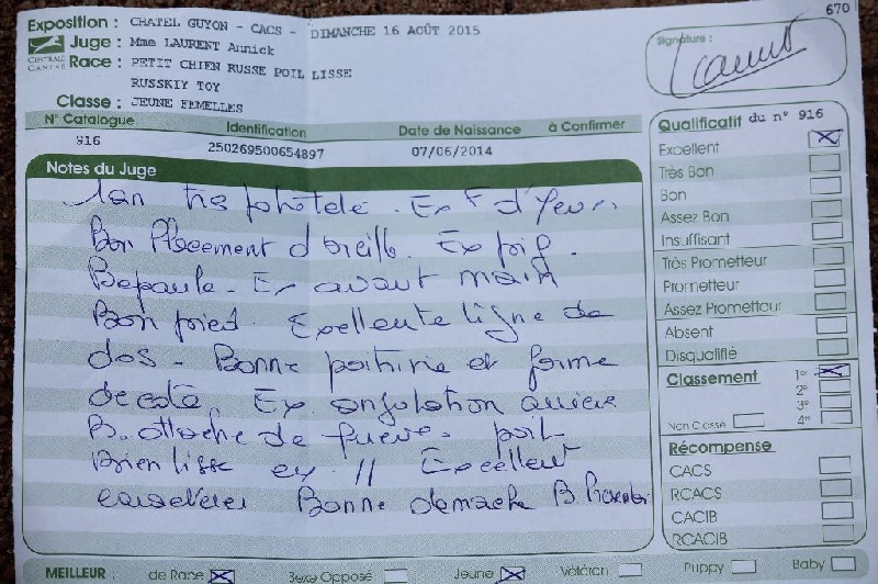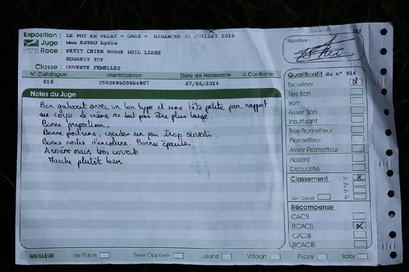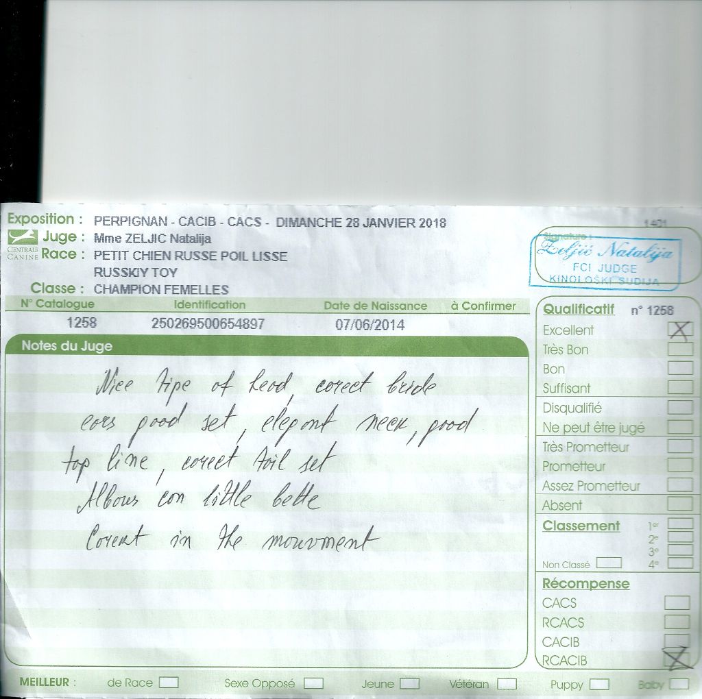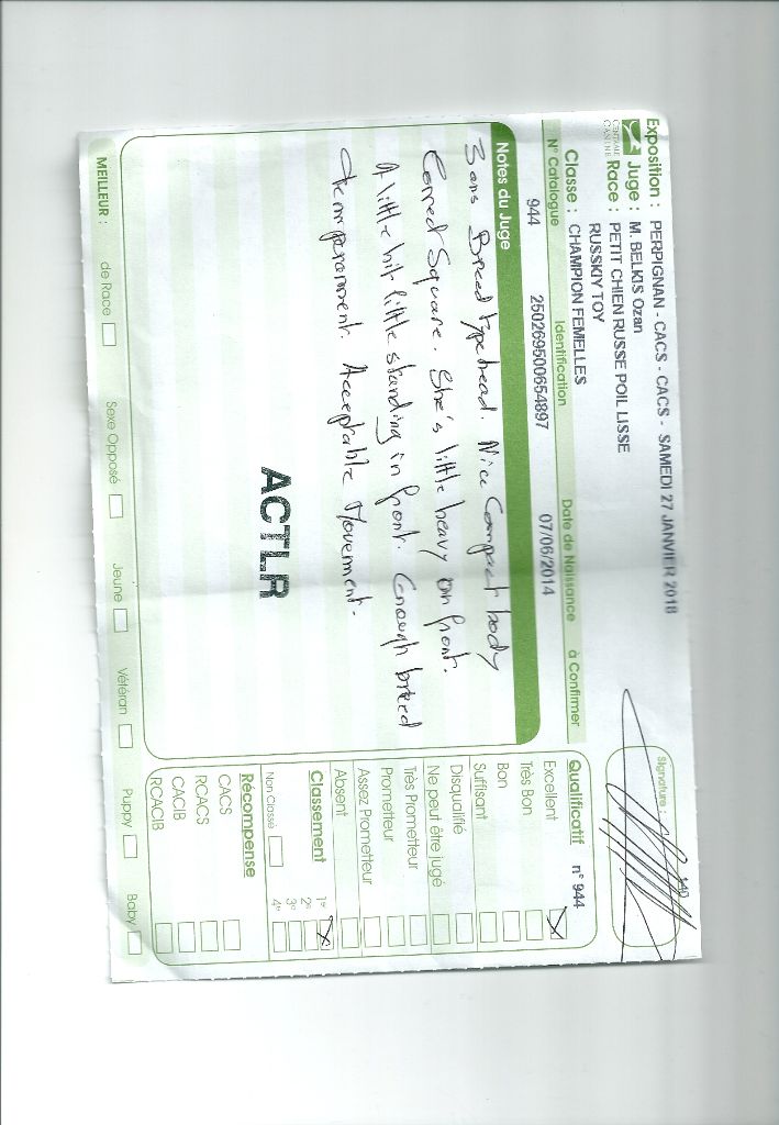 Exc type parfaitement défini.Exc tête bien proportionnée, TB expression.Etablissement harmonieux ( ?)Bon équilibre angulaireBons aplombs Allure libre et fluide. Mouvement géré.