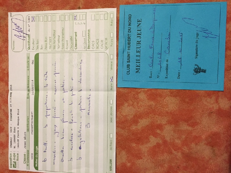 2eme excellent classe intermédiairesujet bien construit tête bien proportionnéeTB oreilles B portéespoitrail et poitrine en place EXC attache et port de fouetEXC ossature EX robe et masquese déplace tres bien