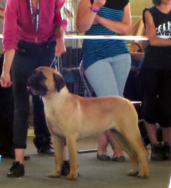 9 mois, sujet bien proportionné pour son age.Tête: belle construction, expression typique,TB oeil forme et couleur, TB port d'oreilles, denture correcte.Corps: TB dos croupe et queue, tb poitrine de jeune,tb angulations av/ar, ossature puissante,tb applombs av/ar,tb pieds,tb allures, tb caractere.