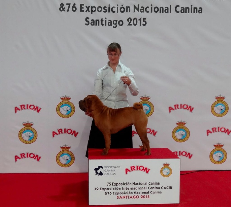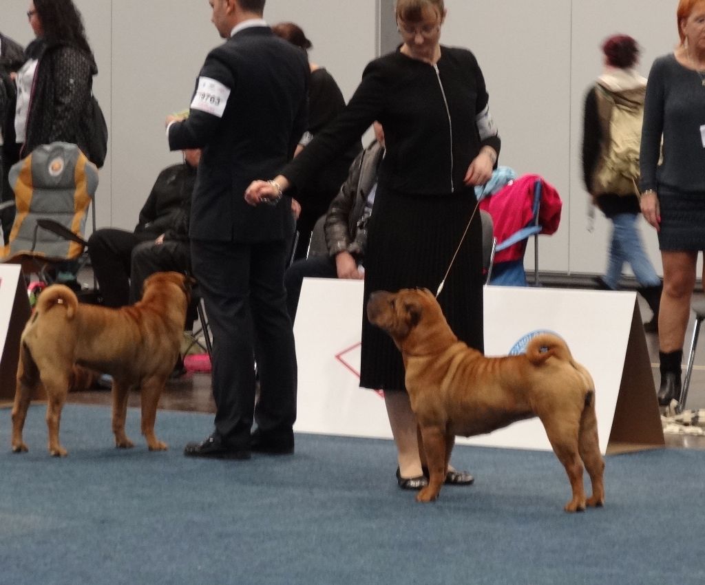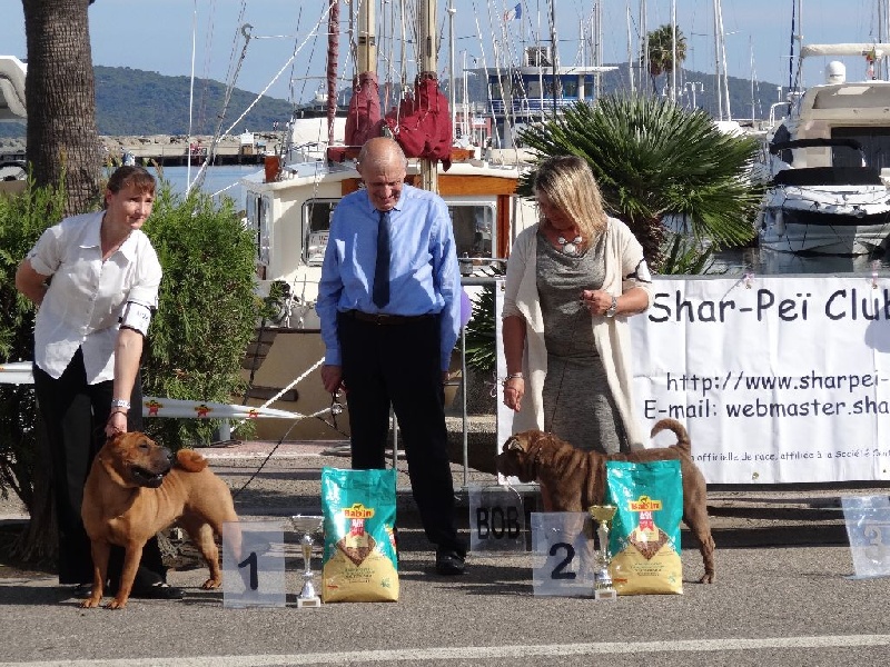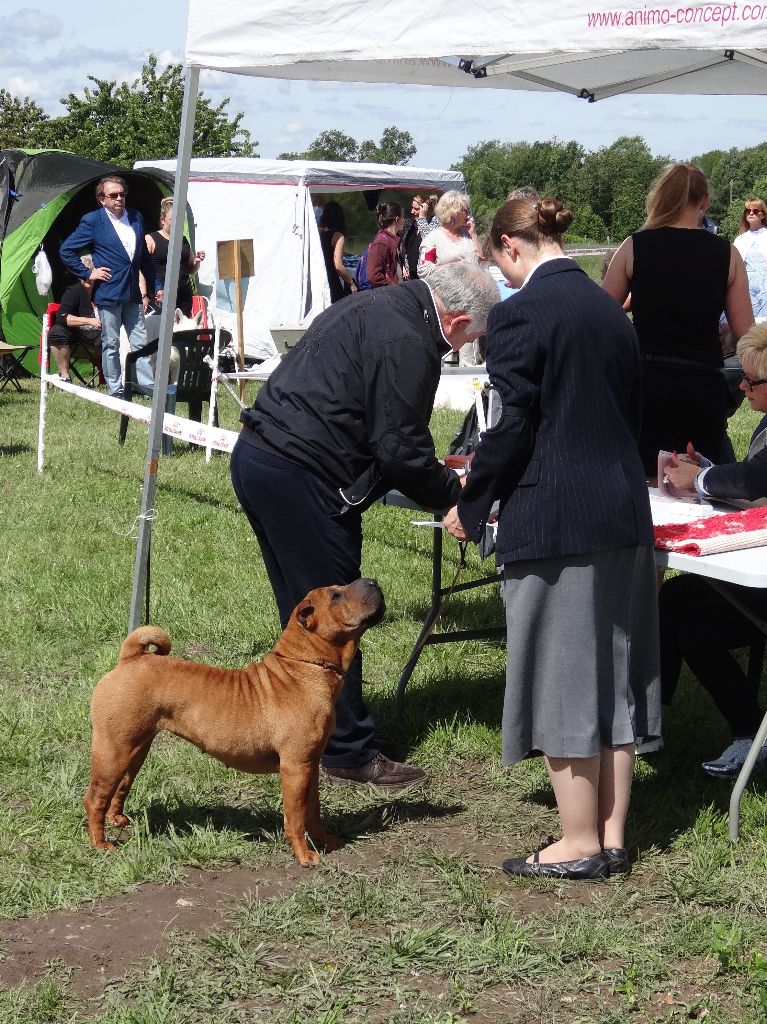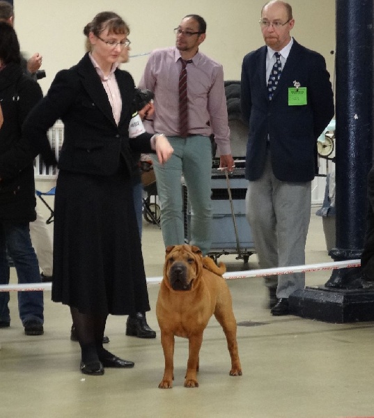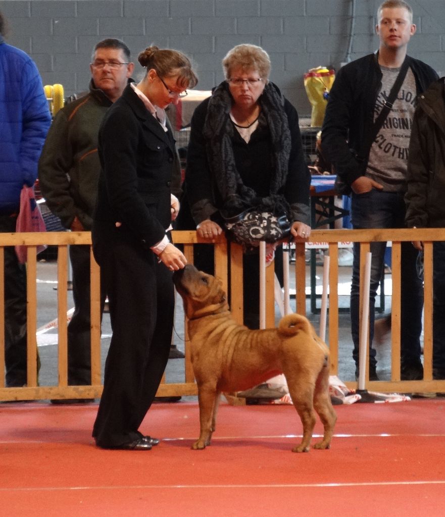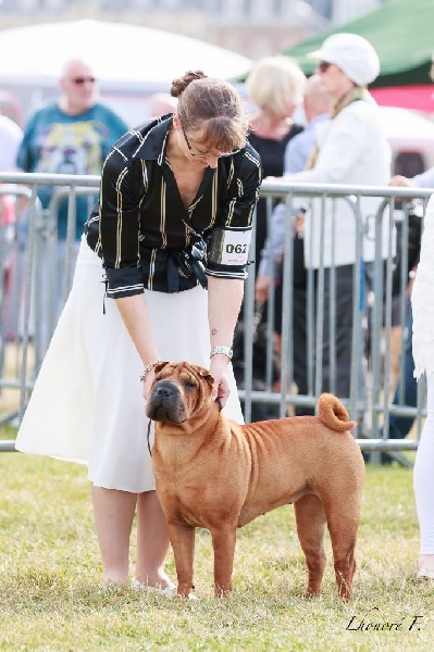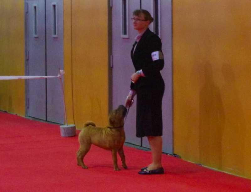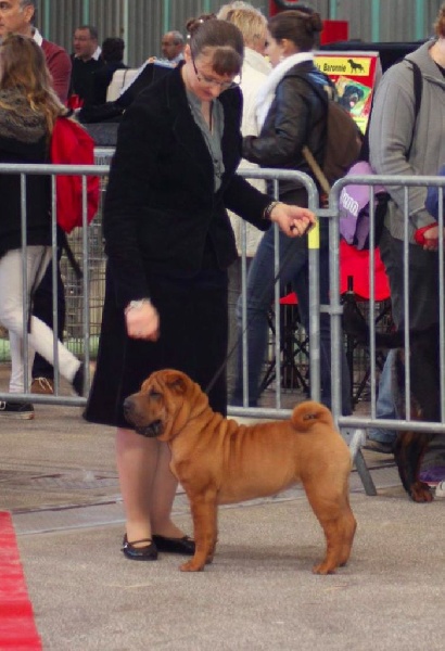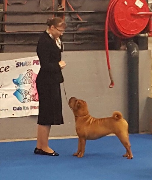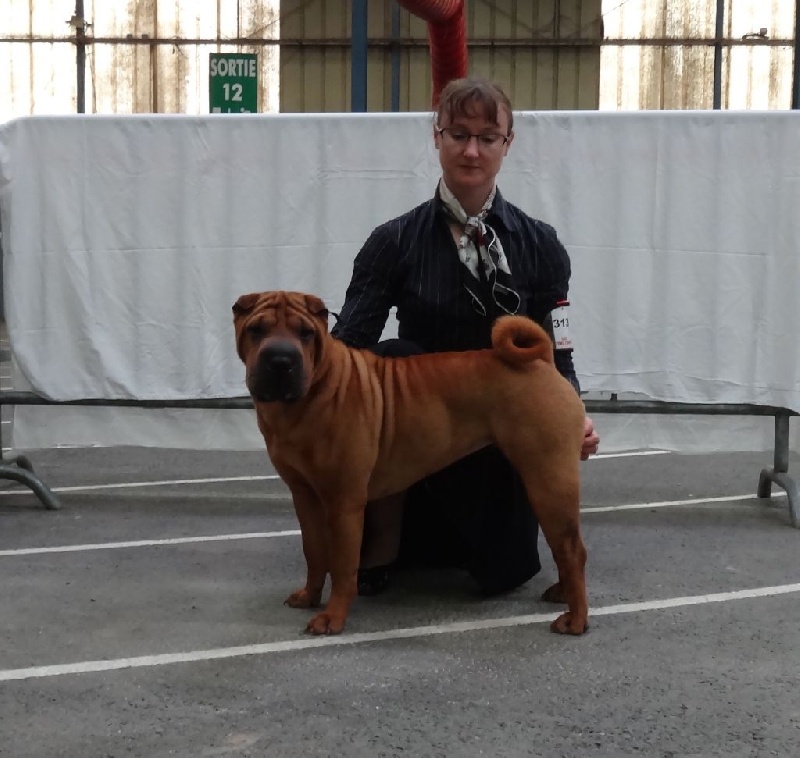 Dentition en ciseau - Jolie construction typique - Garrot bien plongeant et plissé - Poil hérissé - Excellentes angulations - Exc. queue en anneau fermé - Encolure typique - Excellents pieds - Jolie tête - Museau hippo suffisant - Très bons crâne et chanfrein - Oeil sain - Excellents rides et plis - Allures encore juvéniles mais efficace et typique (ligne de dessus du standard conservée en mouvement) - 1ère EXCELLENT - MEILLEUR JEUNE