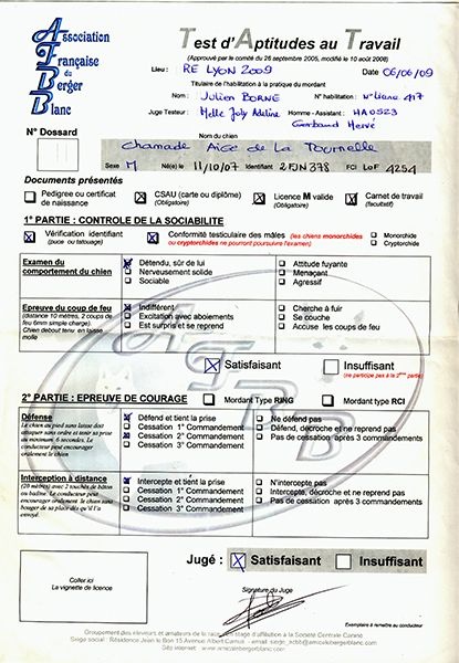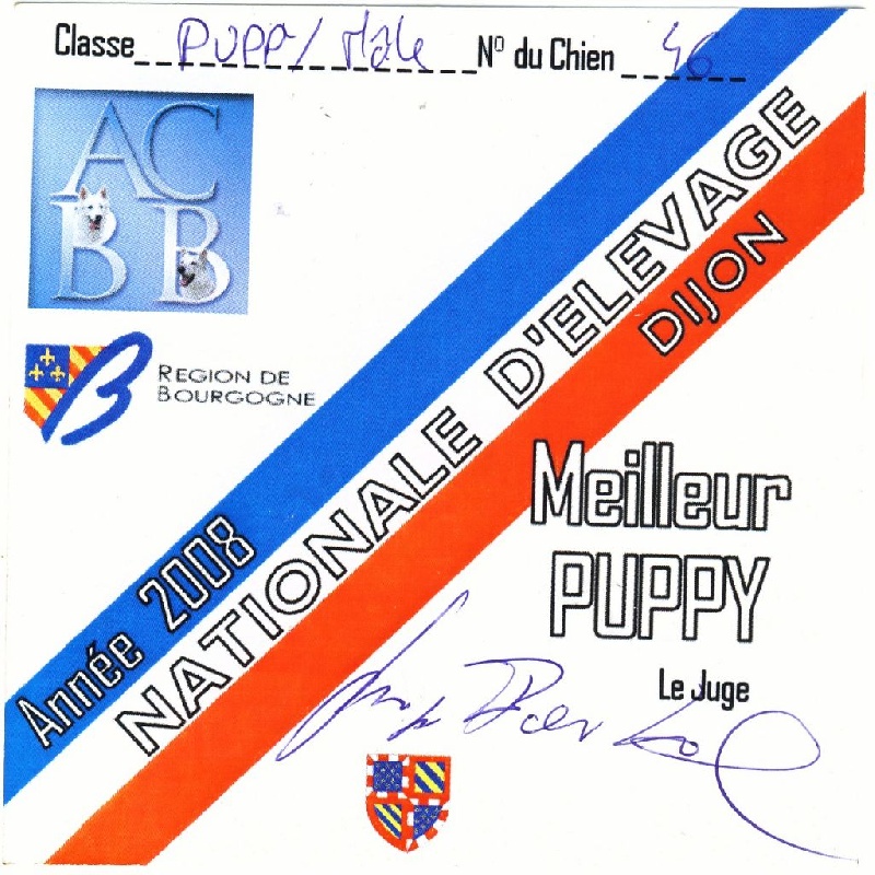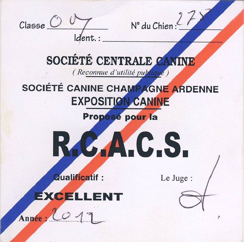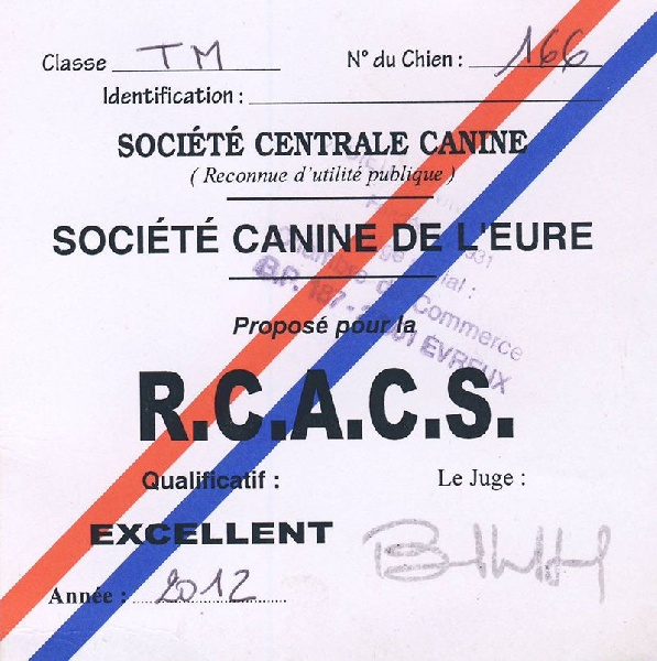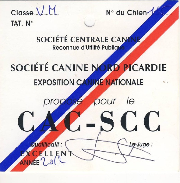 DCC - tête de bonne forme et proportion - très bon crâne et chanfrein - stop à peine marqué - très bonne pigmentation ?il bien foncé - bon port d'oreilles - très bonne encolure - ligne de dessus bien tendue, le rein est un peu long - poitrine d'un bon volume - les aplombs manquent de régularité - se tient sous lui des postérieurs - robe de bonne couleur, bonne texture et sous poil - bon comportement - les épaules manquent de fermeté à la marche.il a passé son TAN 20/20 et son TAT réussi sur costume